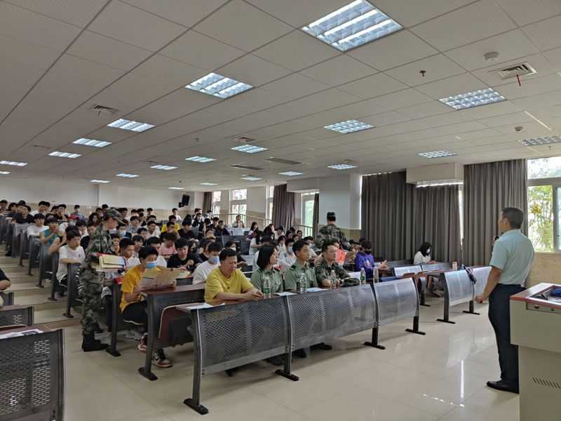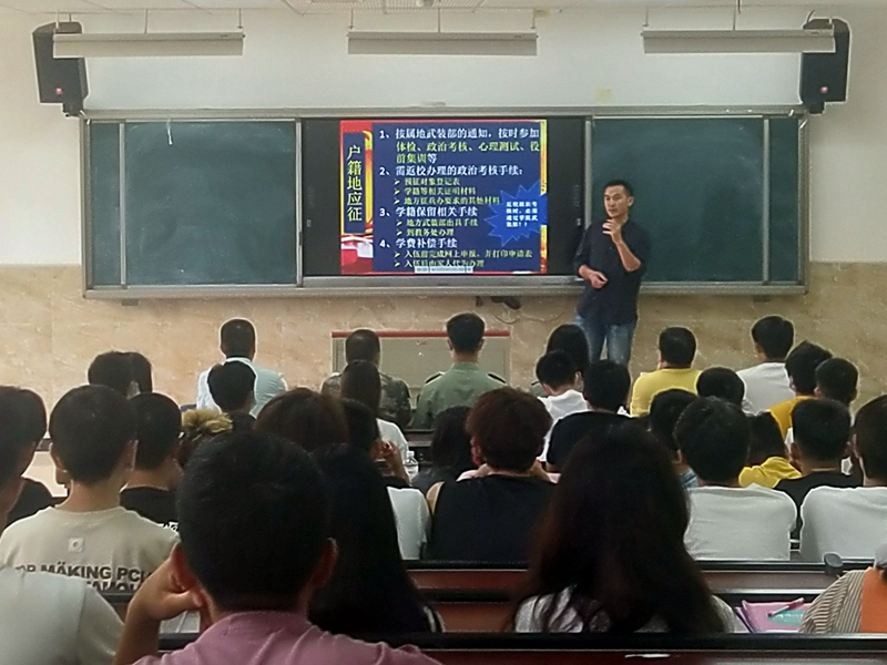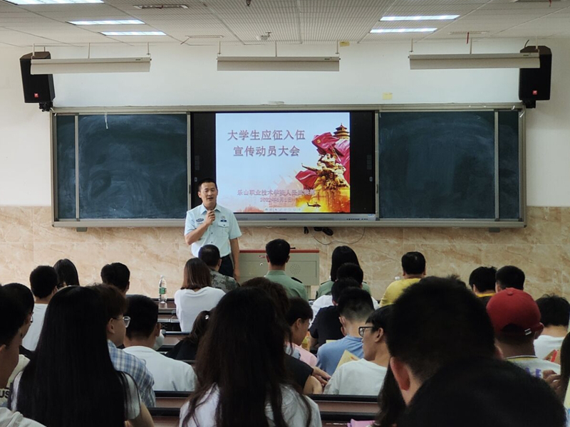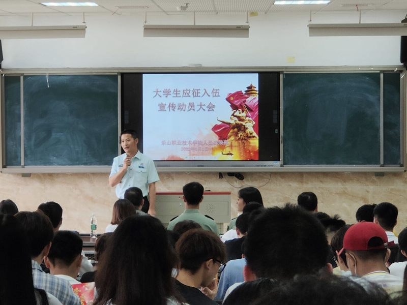 携笔从戎,绽放青春。为积极响应党和国家的号召,鼓励大学生积极参军入伍,在国防事业和军队化建设上贡献力量,8797威尼斯老品牌武装部于2022年6月1日下午13:40-4:00在教学楼2C102召开征兵宣传动员大会。会上特邀了乐山市市中区征兵办公室工作人员进行政策宣讲并现场答疑。