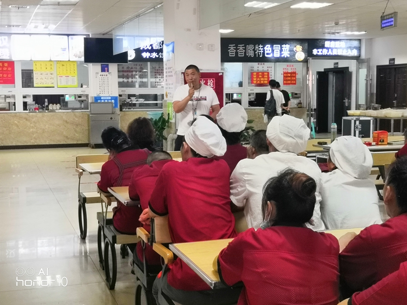 为认真贯彻《中华人民共和国消防法》,提高学院食堂工作人员的消防安全意识和自救互救能力,5月18日下午,学院保卫处消防管理人员徐波、唐俊伟在一食堂二楼为食堂全体员工开展了一次消防安全知识培训。