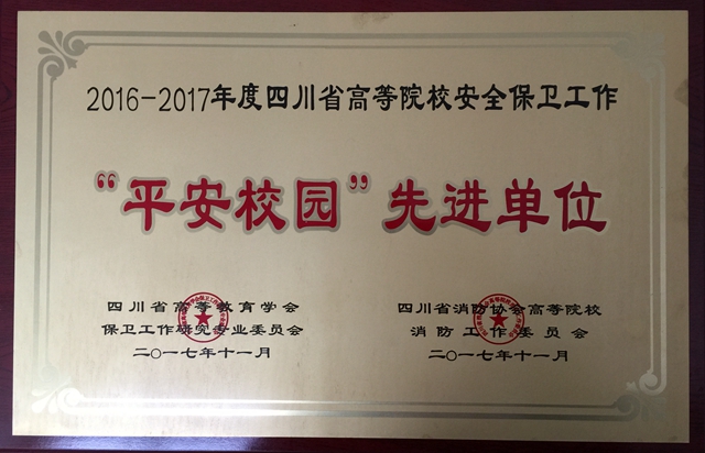 2017年11月15-17日在绵阳召开的四川省高教学会、消防协会2017年年会暨“平安校园”建设表彰大会上,我院被评为2016-2017年度“平安校园”先进单位,陈德强同志被评为 “平安校园”建设先进个人,严秀虎同志被评为“平安校园”建设保安先进个人,吴彪、许本荣、依尔五且等三名同学被评为“平安校园”建设学生先进个人。