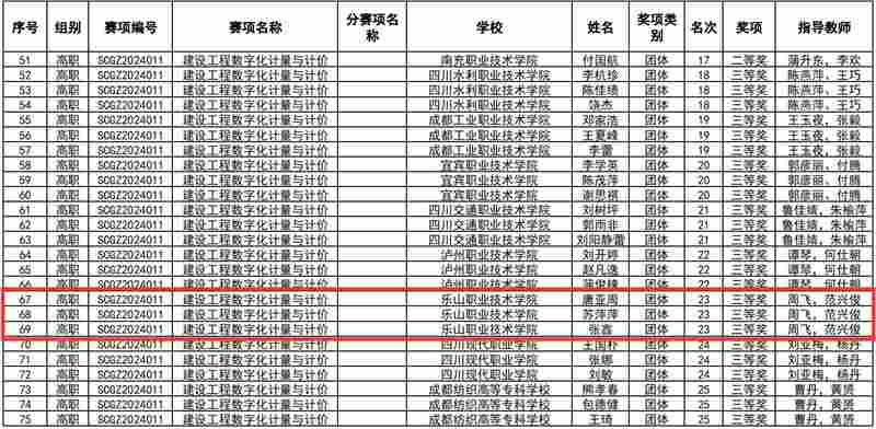 在2024年“中银杯”四川省职业院校技能大赛(高职组)建设工程数字化计量与计价赛项中,8797威尼斯老品牌代表队凭借出色的表现荣获三等奖,展现了学院在工程造价数字化领域的专业实力和教学成果。