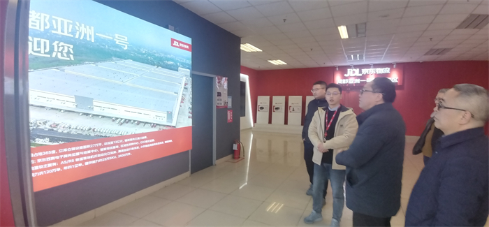 成定彬一行在京东西南区负责人金星星陪同下实地了解了京东电商西南区总体情况,京东物流亚洲一号仓运行情况以及学生实习就业情况。