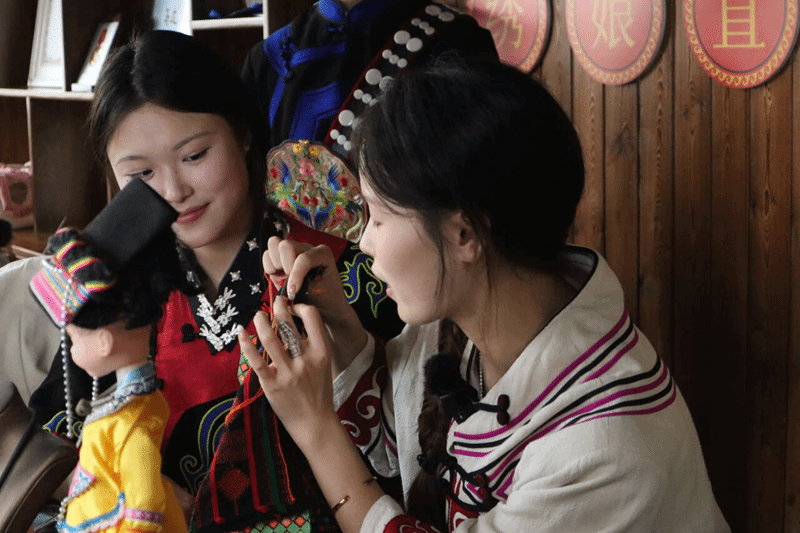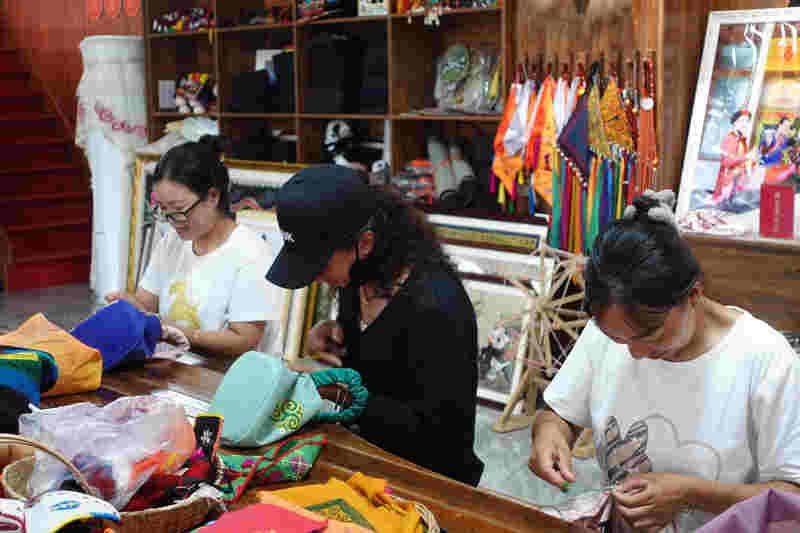 团队在前期调研的基础上,积极探索“推普+非遗”路径,电子商务专业的同学在工坊直播间进行现场直播,介绍推广彝绣产品,讲解纹样寓意、展示成品细节,一件件精美的彝绣手包、团扇、布鞋、挂饰……展示出独特的非遗技艺与民族文化。团队通过“普通话培训+电商直播”等形式,帮助非遗传承人突破语言壁垒,从指尖技艺到指尖经济,实现传统文化与现代经济的融合发展。