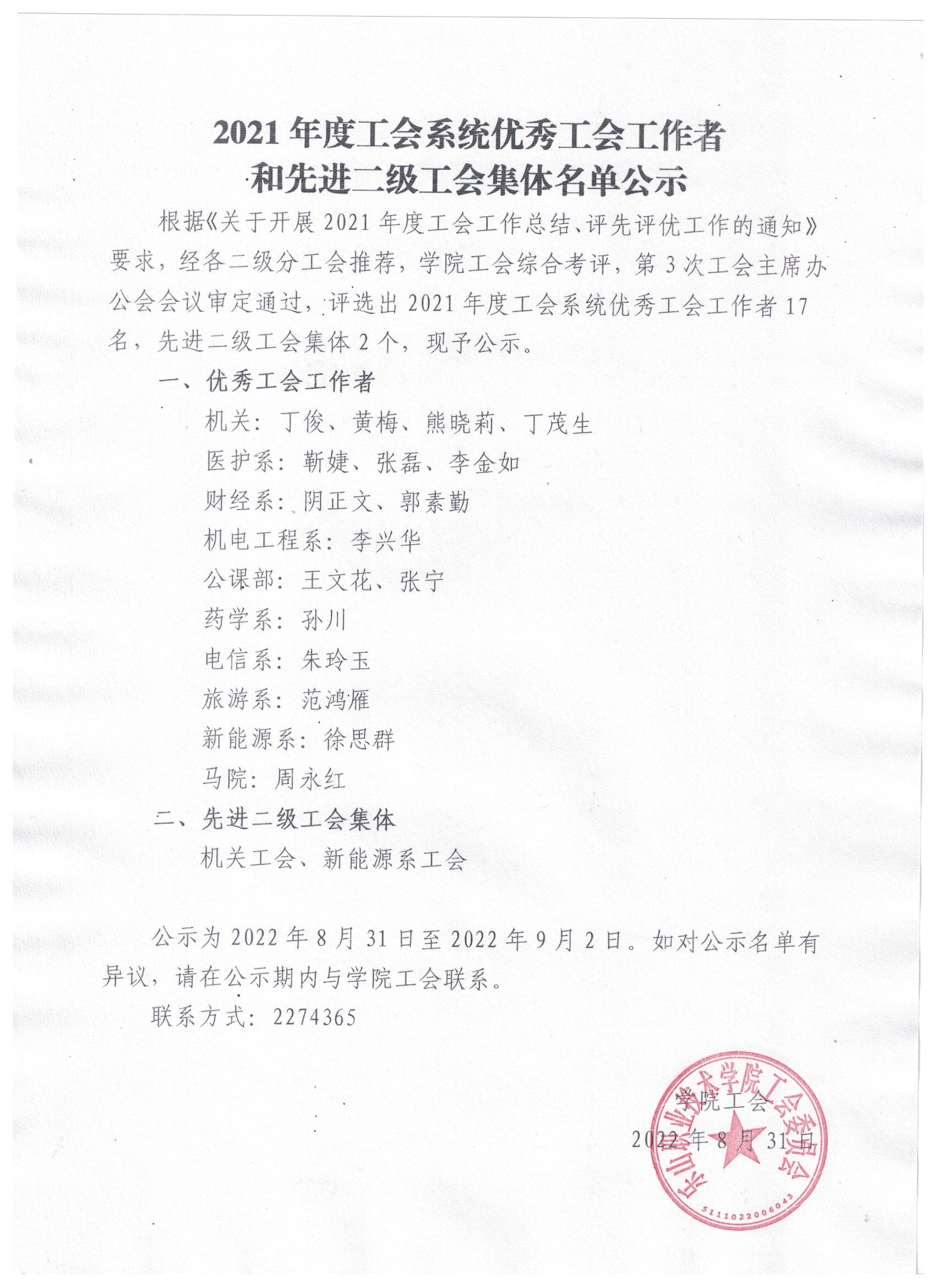 2021年度优秀工会工作者和先进二级工会集体名单公示