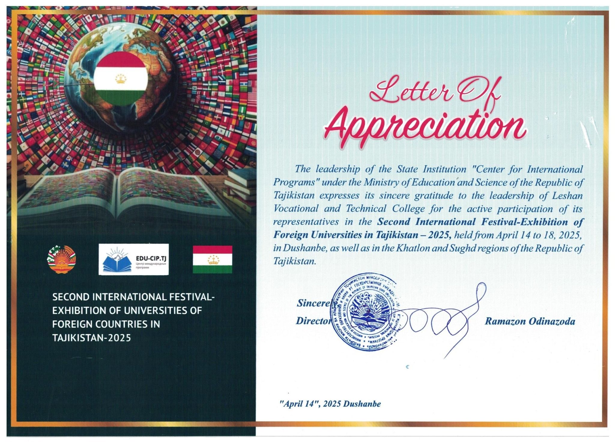 During the education exhibition, Leshan Vocational and Technical College was highly praised by the organizers for its active contribution to promoting China-Tajikistan vocational education cooperation. The college received a letter of appreciation from the Ministry of Education and Science of Tajikistan, expressing gratitude for the college's active participation and support for the international education exhibition. In addition, the college was awarded the honorary plaque of "Tajikistan Study Abroad Base Cultivation Institution", marking its significant status and influence in the field of international education cooperation.