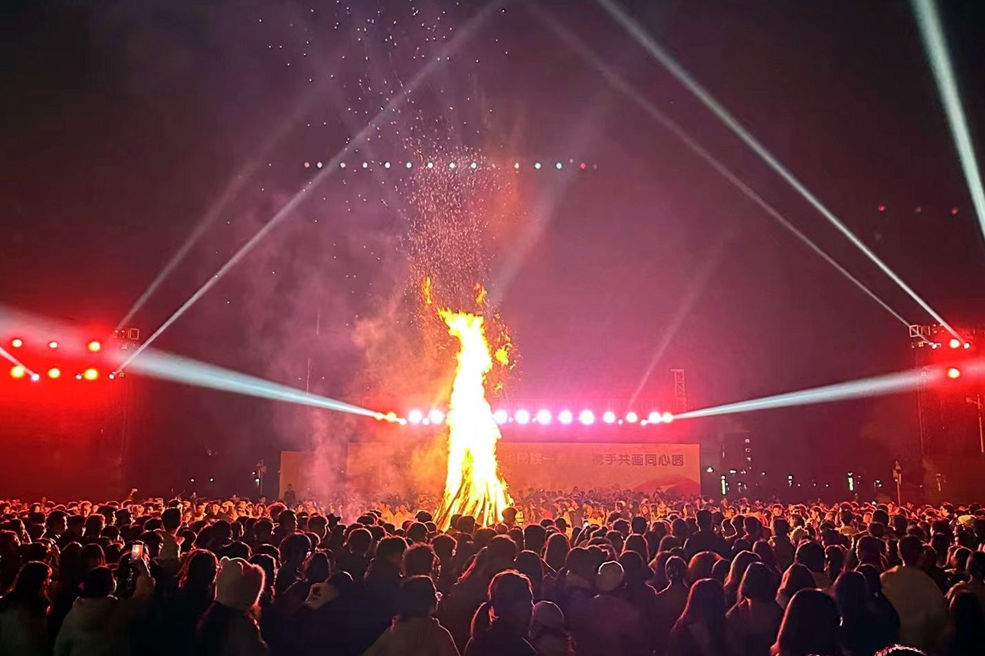 On November 19, 2023, at 7:00 PM, students of various ethnicities gathered at Mingde Square to participate in the "All Ethnic Groups of China Are One Family, Join Hands to Draw a Common Circle of Unity" national unity themed bonfire evening party. The event was hosted by Hu Wenjie, Director of the Student Affairs Department of Leshan Vocational and Technical College. Leaders in attendance included Ou Chongqin, a second-level researcher from the Leshan Municipal Ethnic and Religious Affairs Commission; Xu Binling, Mayor of Suji Town, Shizhong District, Leshan City; Zhang Xuehe and Feng Jiafu, members of the school's Party Committee and Vice Presidents. Ou Chongqin and Feng Jiafu delivered speeches, extending New Year greetings to Yi students and emphasizing the importance of unity and solidarity. Subsequently, Zhang Xuehe declared the commencement of the themed bonfire evening party. Students from various ethnic groups danced the beautiful Dati dance around the lively bonfire, hand in hand, to the cheerful music, painting a beautiful picture of unity and harmony among all ethnic groups.