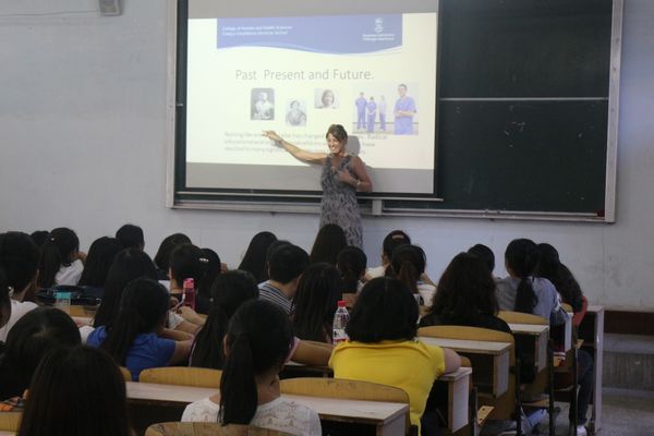 In the afternoon of the same day, Catherine Williams and her delegation of five people from the School of Public Health at Swansea University visited the Nursing Department to deliver a presentation and toured the nursing skills training laboratory.