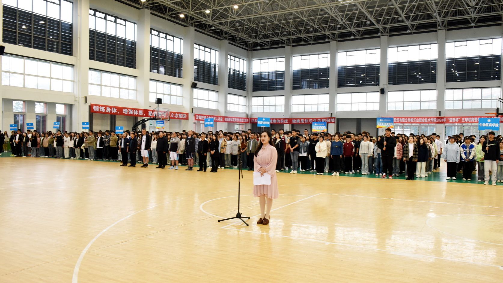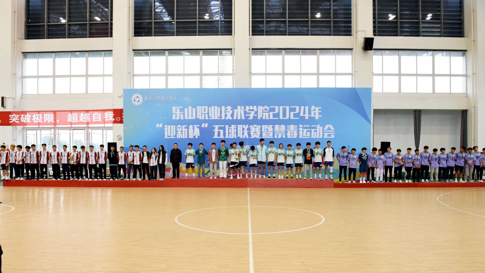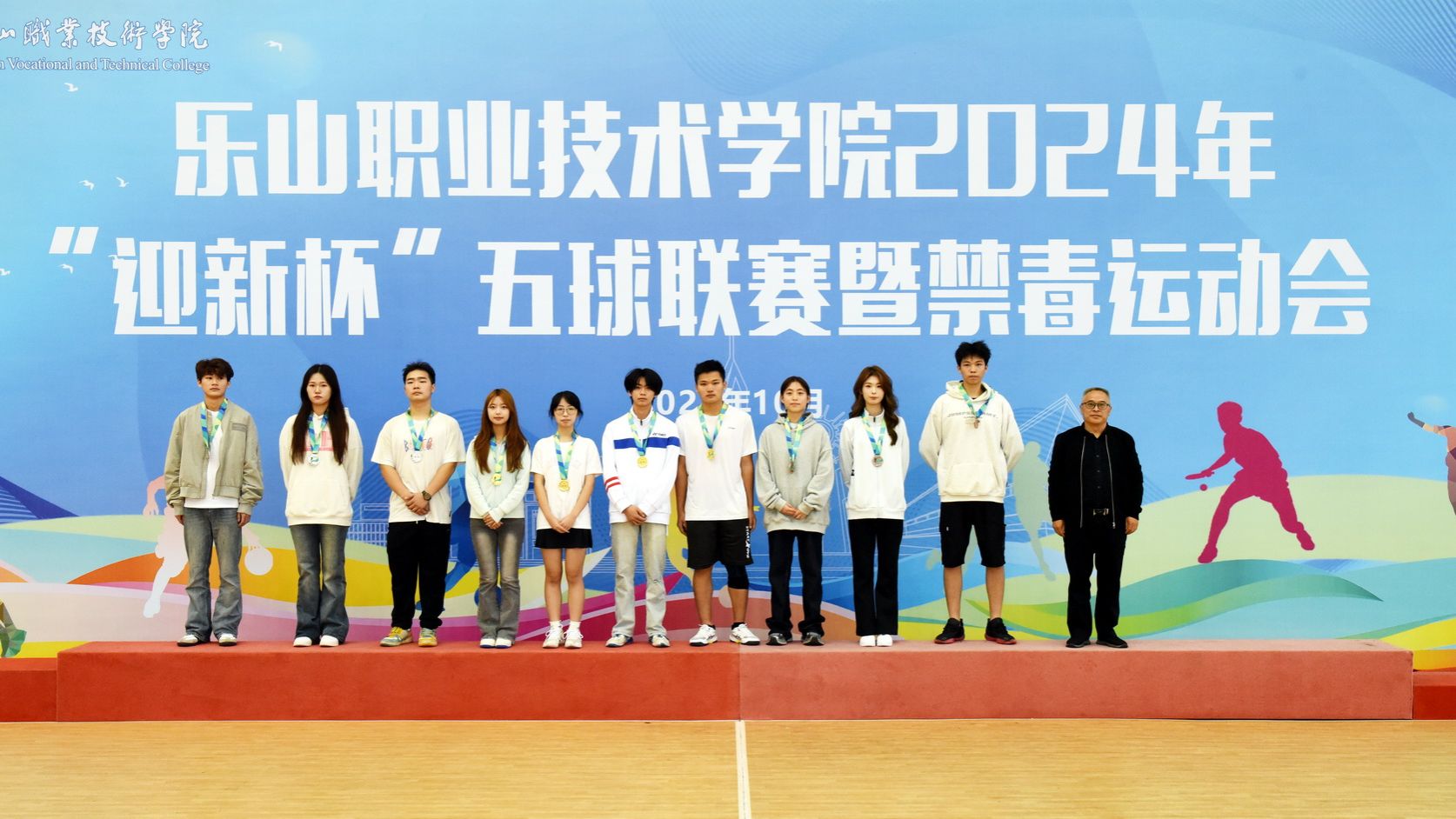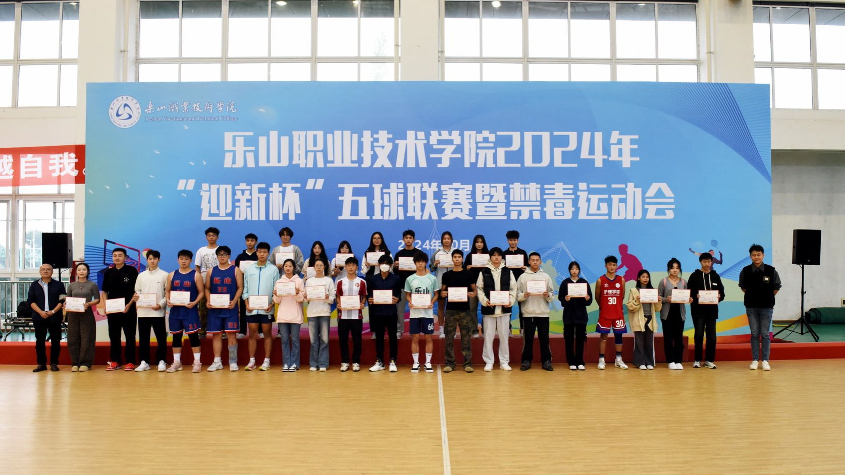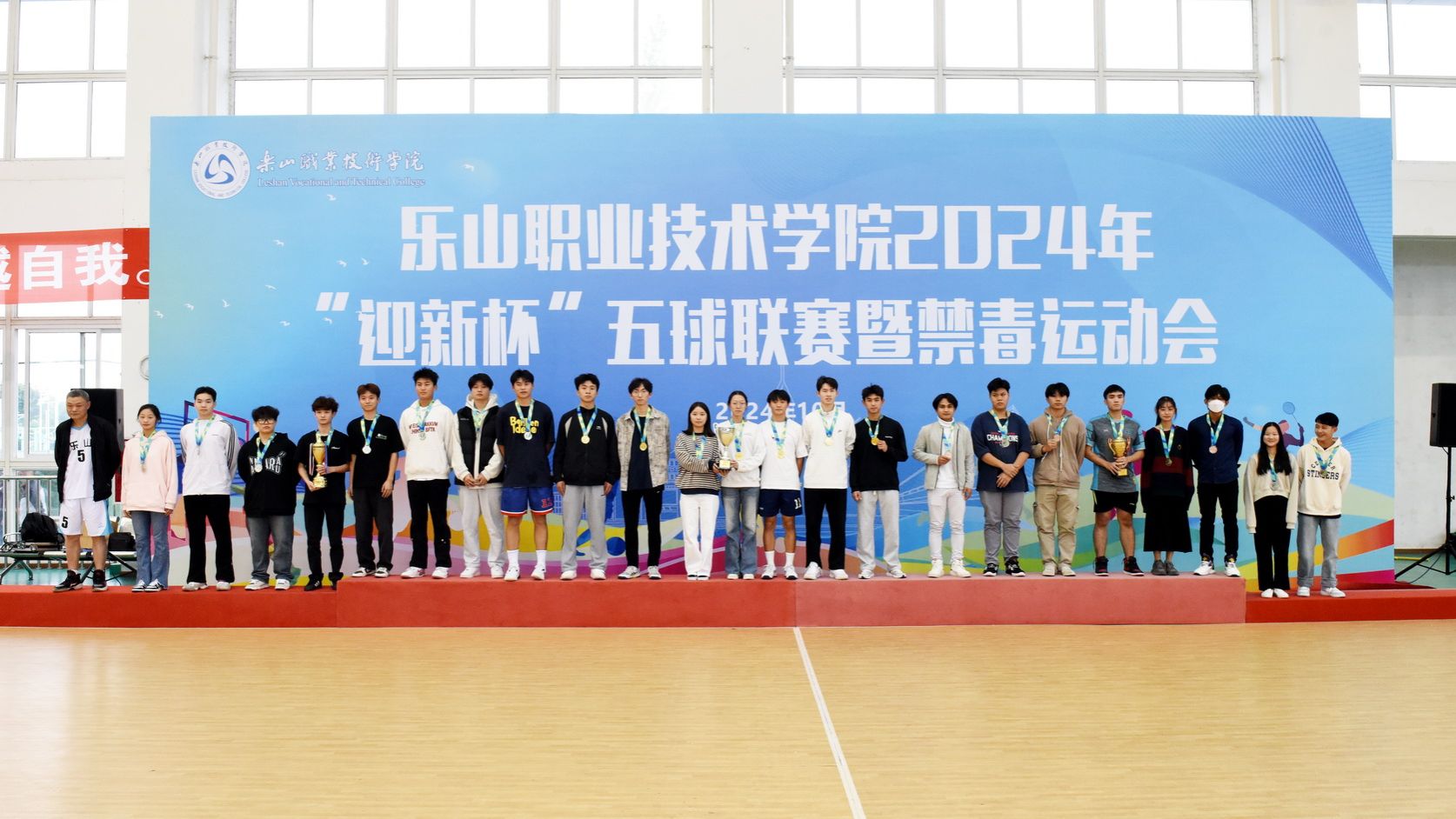 On the afternoon of October 30, 2024, the award ceremony for Leshan Vocational and Technical College's 2024 "Welcome Freshmen Cup" Multi - Ball League and Anti - Drug Sports Meet was held in the gymnasium. Cheng Dingbin, Secretary of the School's Party Committee, attended and announced the end of the sports meet.