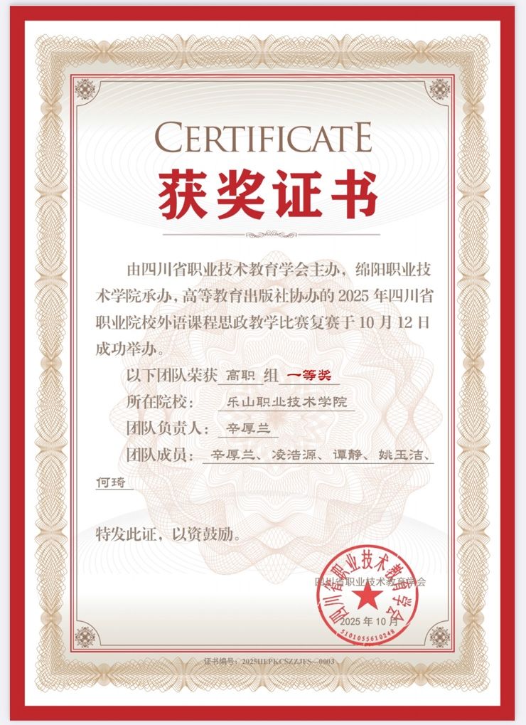 10月12日,2025年四川省职业院校外语课程思政教学比赛决赛圆满落幕。经过激烈角逐,威尼斯素质教育学院英语教师辛厚兰、凌浩源、谭静、姚玉洁、何琦组成的参赛团队凭借其深刻的课程思政内涵、创新的教学设计以及精彩的现场发挥,最终获得高职组一等奖的优异成绩。这一佳绩充分展现了威尼斯在外语课程思政教学改革上的显著成果。