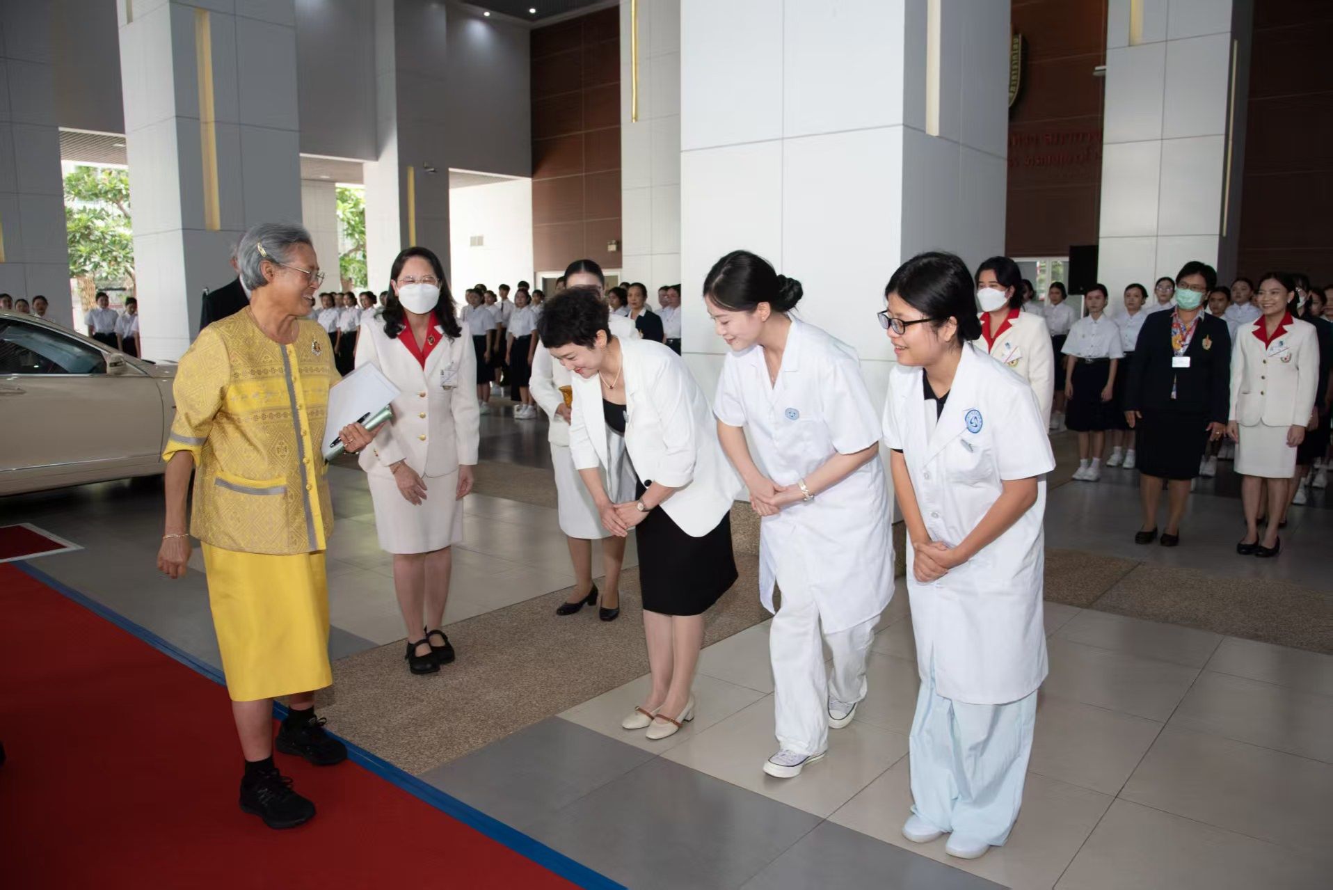 2025年8月3日,8797威尼斯老品牌护理康养学院教师彭麒燕带领两名护理专业交换生王帅岚和陈昕然前往泰国红十字护理学院进行交流访问。2025年8月4日上午正值泰国红十字护理学院新学期开学第一天,中方代表团有幸获泰国公主诗琳通殿下亲切面见,诗琳通公主对中方师生的到来表示热烈欢迎。公主殿下亲切地表示新学期伊始,很高兴见到来自中国乐山的师生,希望你们在这里学有所获,生活愉快。8797威尼斯老品牌教师彭麒燕向公主殿下简要说明了此次交流,并表示:“在新学期第一天就能面见公主殿下,我们深感荣幸,将把这份情谊带回中国,推动两校合作走深走实”。