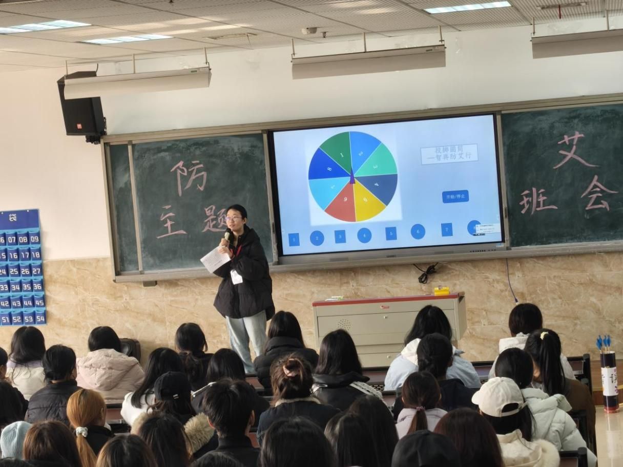 防艾微视频《银蚀》,用影像迅速直击艾滋病对个人与家庭的潜在影响,开启了本次防艾主题班会;“防艾海龟汤”则将三大传播途径等知识融入剧情谜题,参与者以问答推理形式探寻“汤底”真相,在趣味博弈中深化对传播原理的认知。核心环节采用“知识科普+成果展示”双线模式,让绘画、科普比赛等获奖选手通过艺术创作引导同学们深入思考关爱与防艾,展现防艾教育的共情与支持、希望与力量、平等与尊重、预防与责任等核心心理要素,在校园构筑理解、包容、积极健康的心理防线。接着,又通过沙包骰子触发考题的“智弈防艾行”环节,参与者在答题闯关赢取礼品的过程中,巩固防护知识、强化行为自觉,让防艾意识真正落地为行动指南。活动尾声以《爱自己,从一张试纸开始》的视频分享温馨收尾,呼吁同学们正视艾滋病自我检测的重要性,树立主动防护、科学防艾的健康观念。
