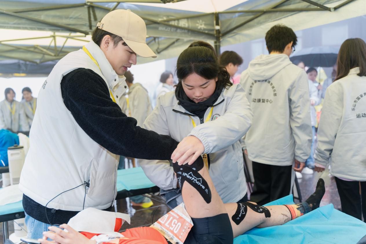 赛事当天,师生团队凌晨5点便抵达终点康复服务站投入工作。上午10时左右,一名27公里组选手出现小腿肌肉痉挛,志愿者迅速运用“扳机点按压技术”配合冰敷,15分钟内缓解其疼痛。团队还通过动态拉伸、物理治疗等方法,为近200人次选手提供赛后恢复服务,处理运动损伤十余例,获得选手和组委会的一致好评。