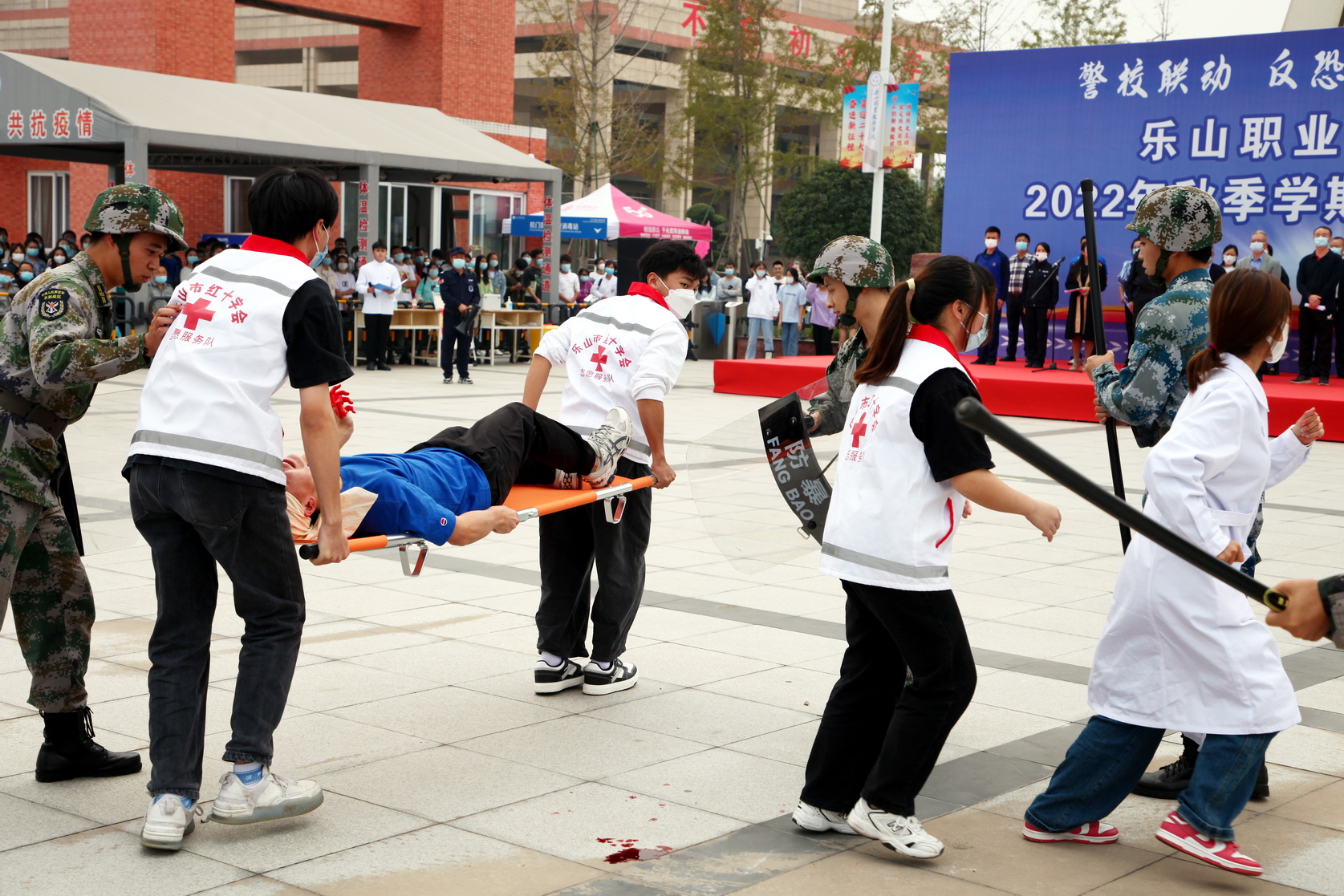 场景一:一名暴徒企图驾车冲进校园,被学校门岗防撞设施成功阻拦后,暴徒便持刀对校门外行走学生实施攻击。保安发现后,第一时间110报警并报告学院,安保人员通过盾棍叉组合战术将暴徒拦阻于校门外。乐山市公安局110接警中心接到警情后,迅速赶赴现场,与学院反恐力量合力将暴徒制服并带走。与此同时,学院民兵连迅速到达现场维持秩序并疏散人群,卫生所工作人员和红十字协会队员对受伤学生进行简单包扎处置后抬离现场。