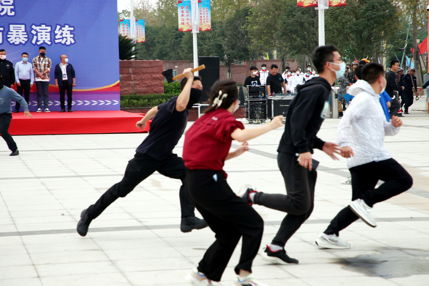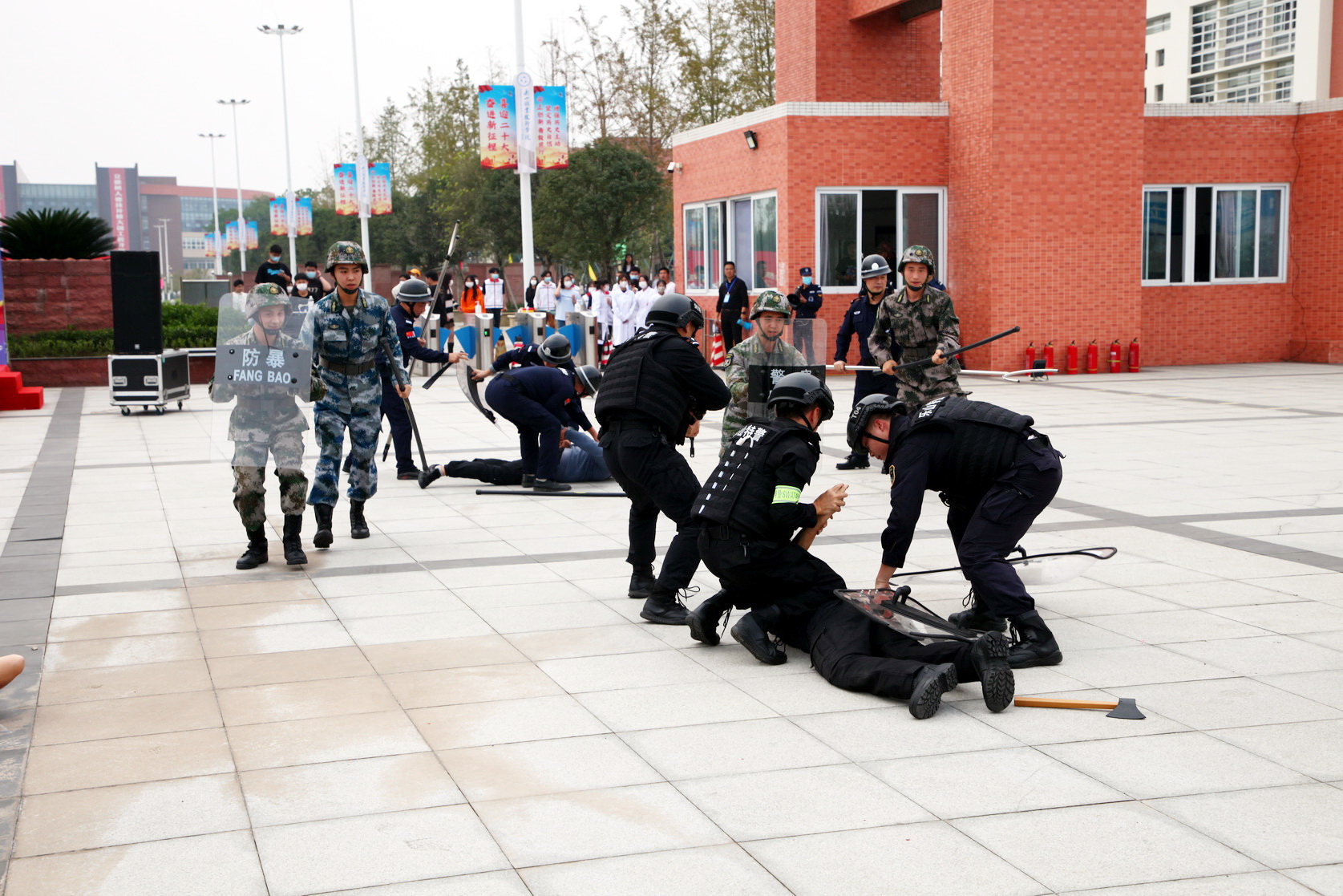 本次演练模拟了不明身份的歹徒企图通过开车冲撞、刀斧砍杀学生,投放爆炸物等方式冲入校园实施暴恐袭击,学院迅速启动反恐防暴预案有序处置,公安干警接警后迅速到达现场合力处置的场景。
