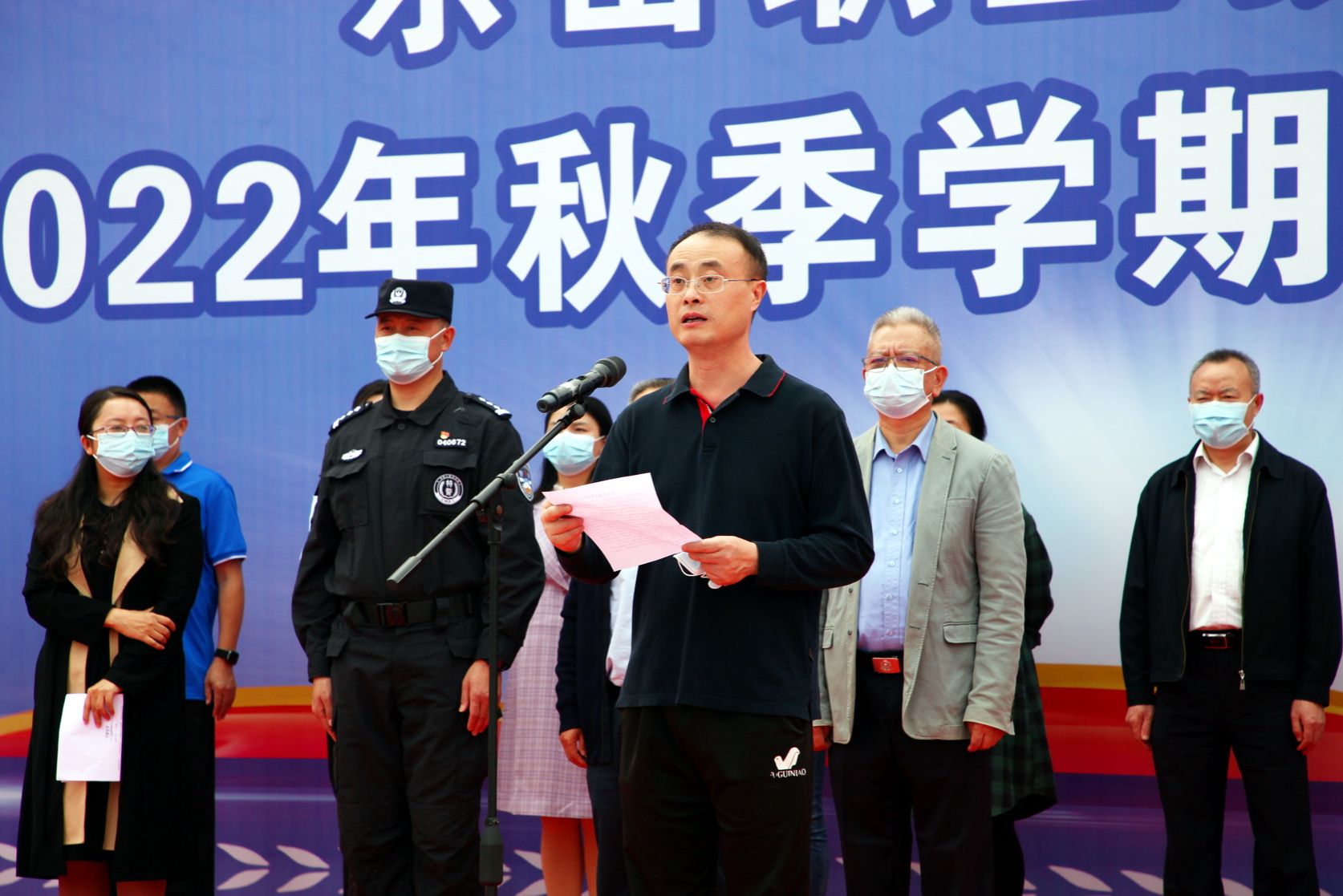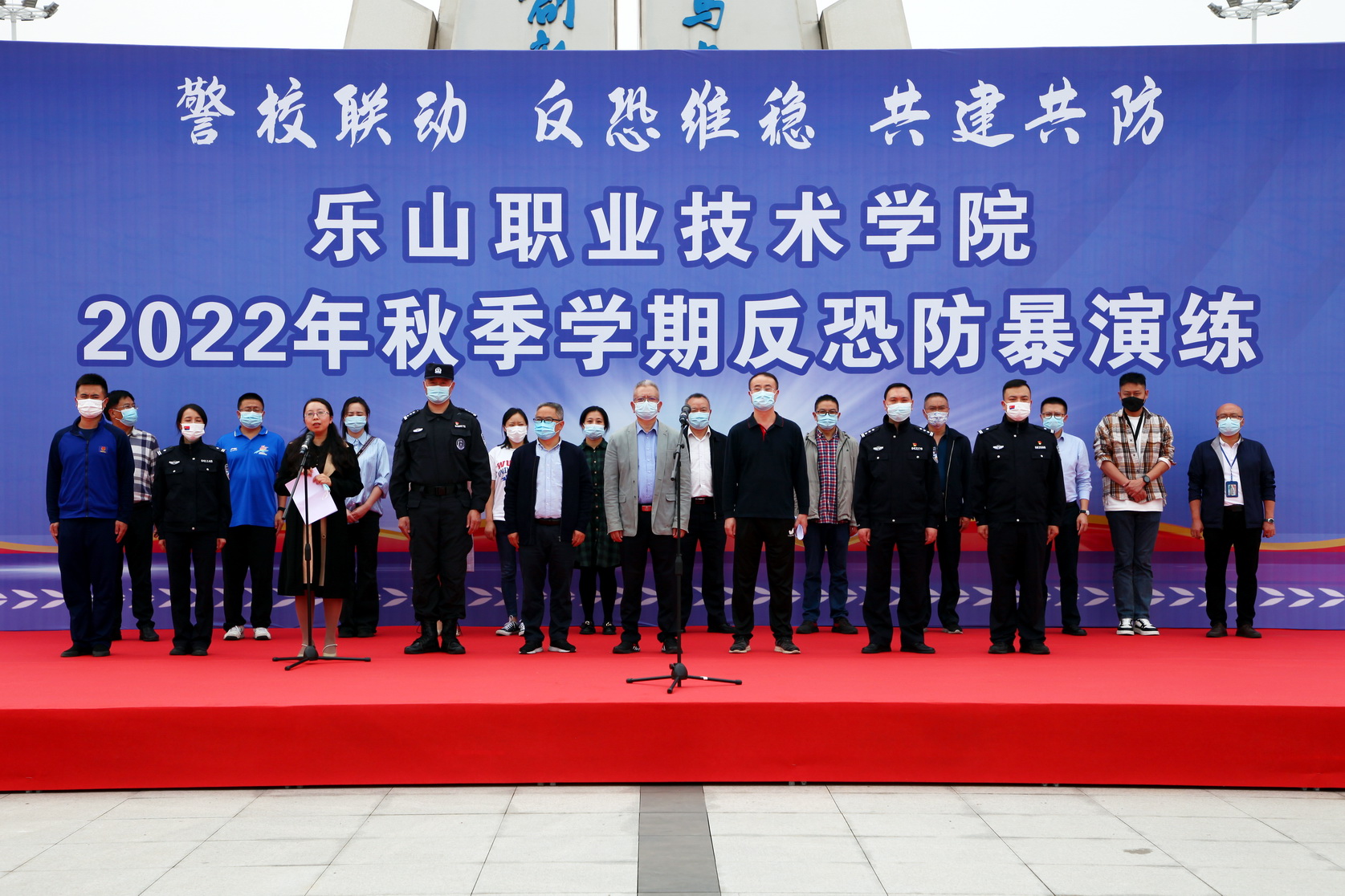 反恐防暴不松懈,守好安全第一关。8797威尼斯老品牌反恐防暴应急演练于10月19日下午在学院正大门举行。乐山市公安局二级高级警长鄢柏华,巡特警支队长周扬彬,反恐支队政委张烈,乐山市消防救援支队特勤站副站长李晨,乐山市中区公安分局苏稽派出所所长王引,副所长刘燕宇,学院院长刘忠,副院长张学河、周芹,学院相关处室负责人及各系党总支书记、专职副书记等近400余名师生参加本次演练。周芹担任反恐演练总指挥。