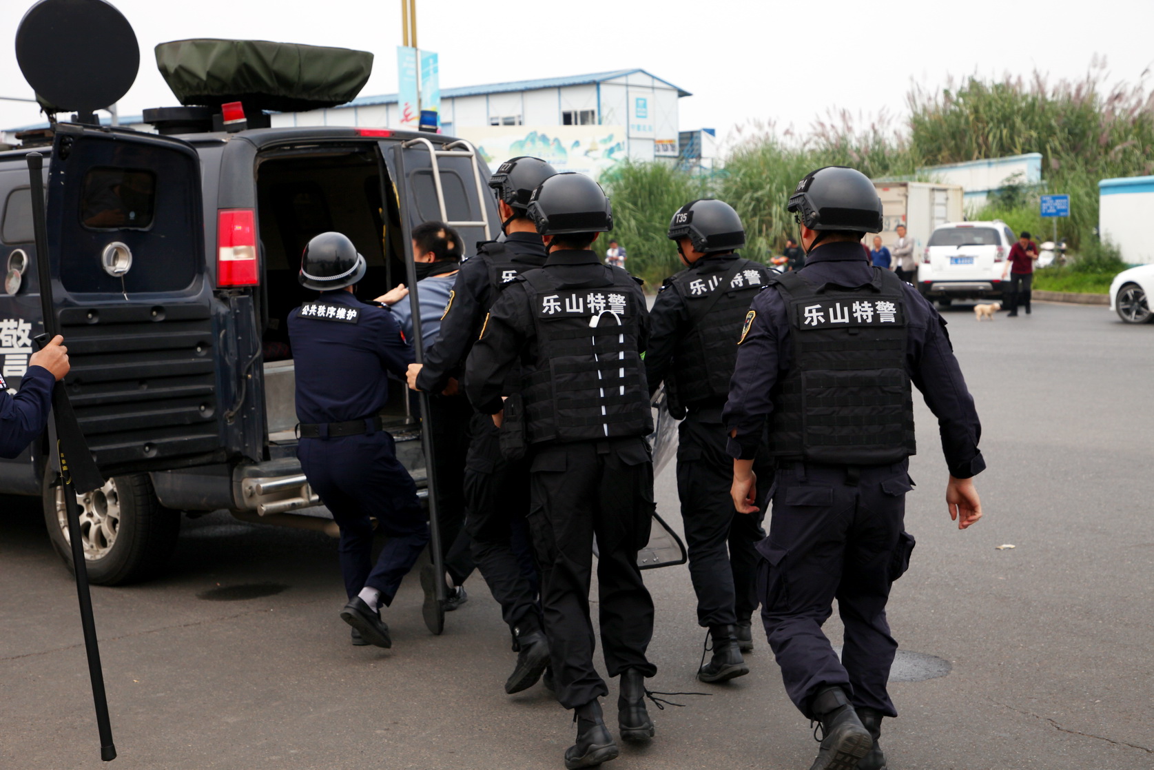 场景二:一名暴徒扬言要投放燃烧物对学院实施纵火行为,并将随身准备好的燃烧物投放到易燃重点区域。保安发现情况后立即将情况报告公安机关,学院保卫处治安科长上前安抚暴徒情绪,为特警和专业力量到达现场争取时间。校卫队警戒组快速拉设警戒线,隔离爆炸区域,驱散围观人群。特警支队专业排爆力量到达现场后成功制服暴徒,迅速带离现场。至此,两起暴恐事件被公安机关与学院反恐防暴专业力量成功处置。