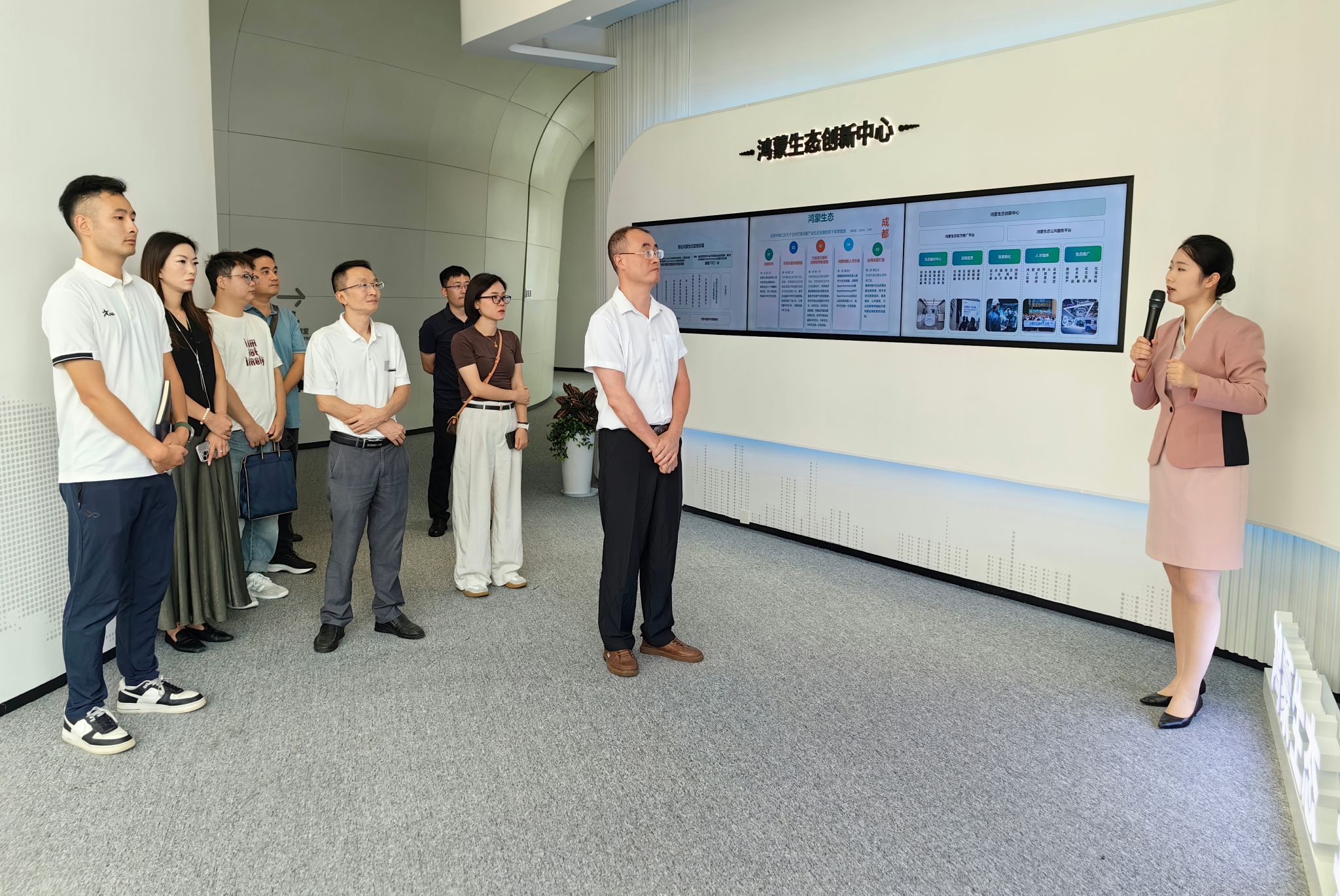 上午,调研组到访鸿蒙(成都)创新中心,听取了中心负责人关于鸿蒙生态建设、技术架构及应用场景的详细介绍,校企双方围绕校企合作、人才培养、课程共建等方面进行了深入交流。