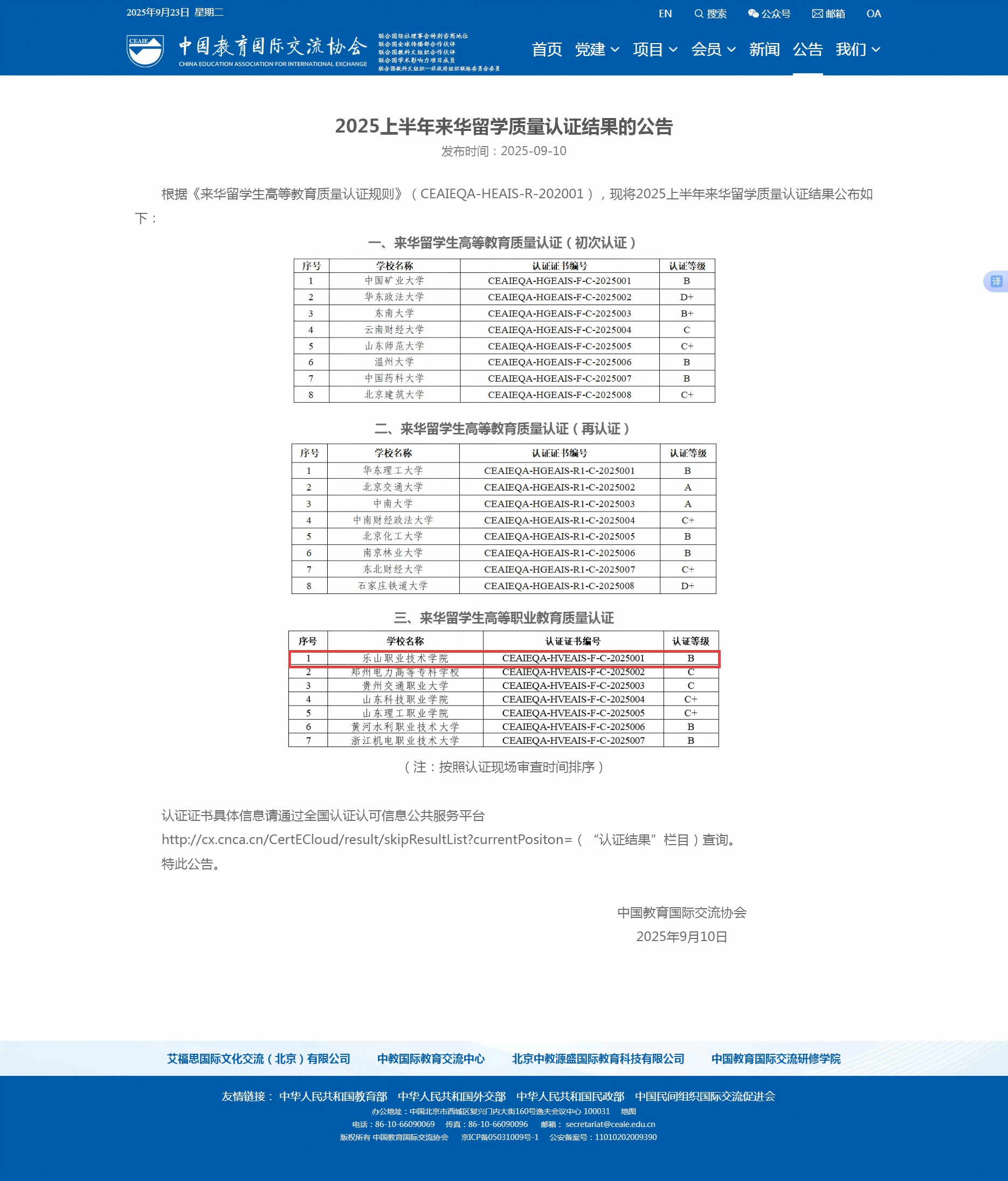 近日,8797威尼斯老品牌在由中国教育国际交流协会组织的2025年上半年来华留学质量认证中,获得B级认证结果,认证有效期六年。这是威尼斯首次参与并通过此项国家级质量认证,标志着学校来华留学教育与管理水平达国家公认标准,获权威认可。