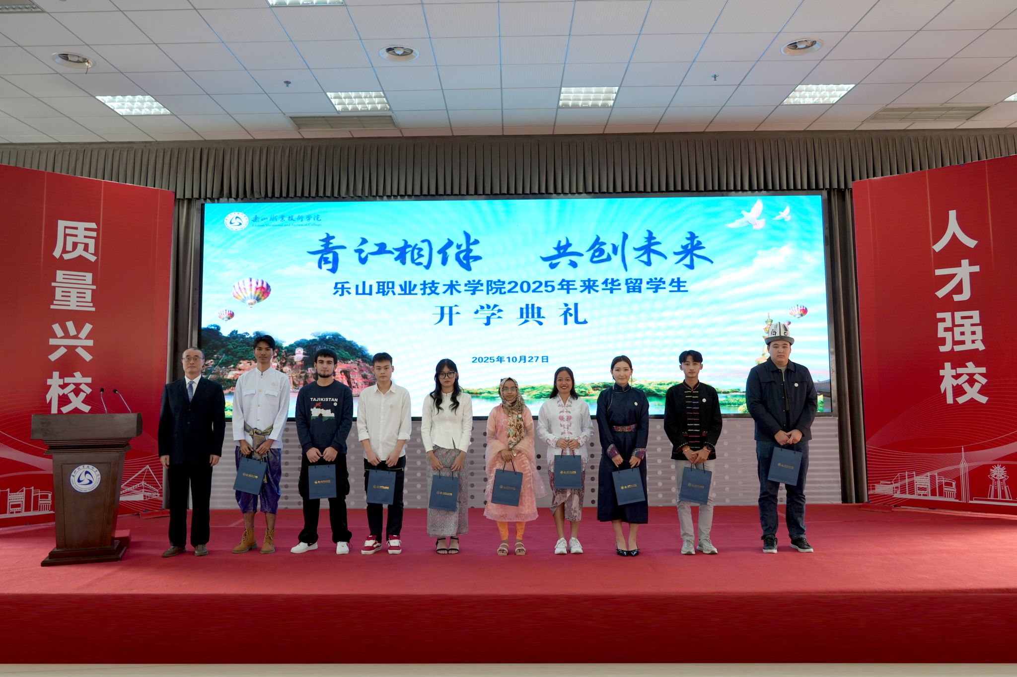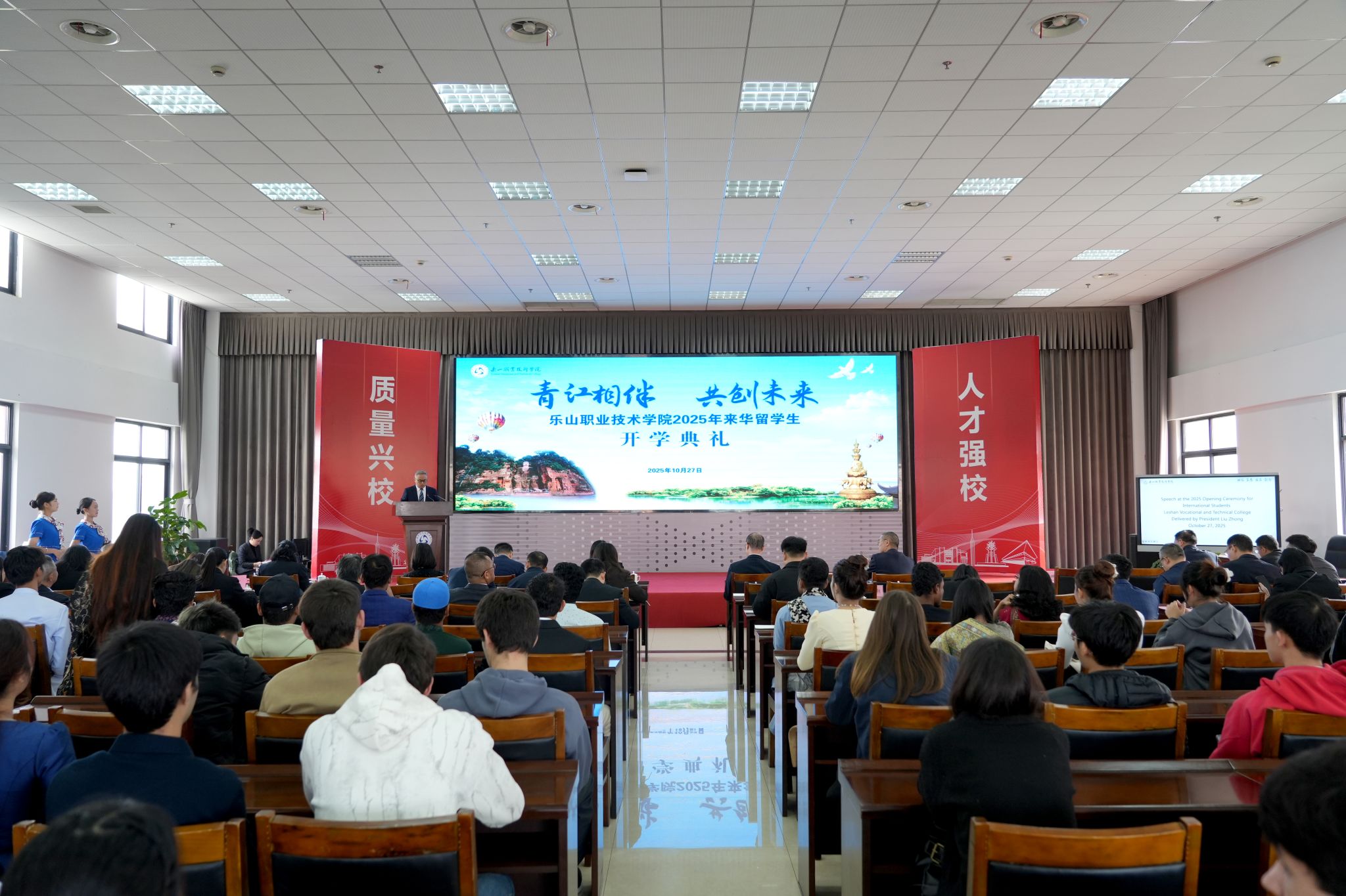 开学典礼在庄严而温馨的氛围中拉开帷幕。刘忠发表了热情洋溢的致辞,向来华新生介绍了乐山这座城市深厚的文化底蕴与优质的教育资源。并围绕来华留学生的成长与发展提出三点期望:一要秉承“诚信、笃志、求真、创新”的校训,涵养品格、锤炼意志;二要专注学业、精进技能,努力成为专业领域的行家里手,为未来职业发展奠定坚实基础;三要主动融入、促进交流,跨越文化与语言障碍,成为中国故事的见证者与传播者,成为推动中外文化交流与人民友好的青年使者。
