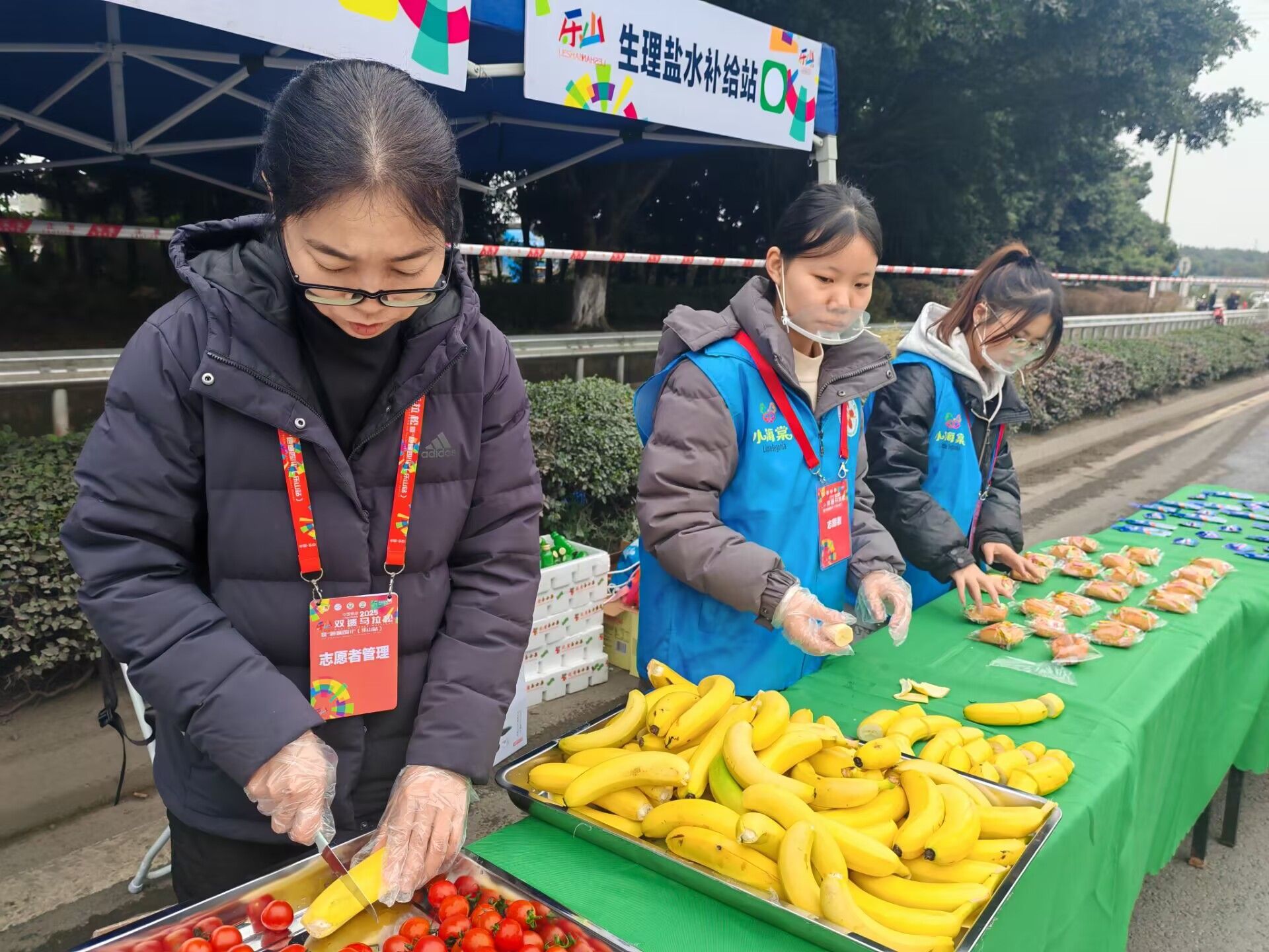 14日凌晨4时,当嘉州大地仍在沉睡,8797威尼斯老品牌的校园内已灯火通明。673名志愿者准时集结,在校团委张瑞琪、郭胜男、初丽媛、李一和刘俊波老师的统筹下分乘10辆大巴赶赴各服务点位,清晨5时前全部到岗就绪。比赛期间,威尼斯志愿者们的身影遍布42.195公里的全程赛道与21.0975公里的半程赛道。在青衣江一桥补给站,医学专业的志愿者们分工协作,将饮用水和功能饮料提前倒好分装,确保跑者无需减速即可便捷取用;在长青路折返点,护理专业学生组成的医疗辅助团队密切观察选手状态,为体力不支者提供降温擦汗、肌肉放松等服务,累计协助处理轻微抽筋、擦伤等情况43起。来自护理学院的志愿者游志兰惠表示:“课堂上学习的急救知识此刻派上了大用场,能为跑者的安全保驾护航,再冷再累都值得。
