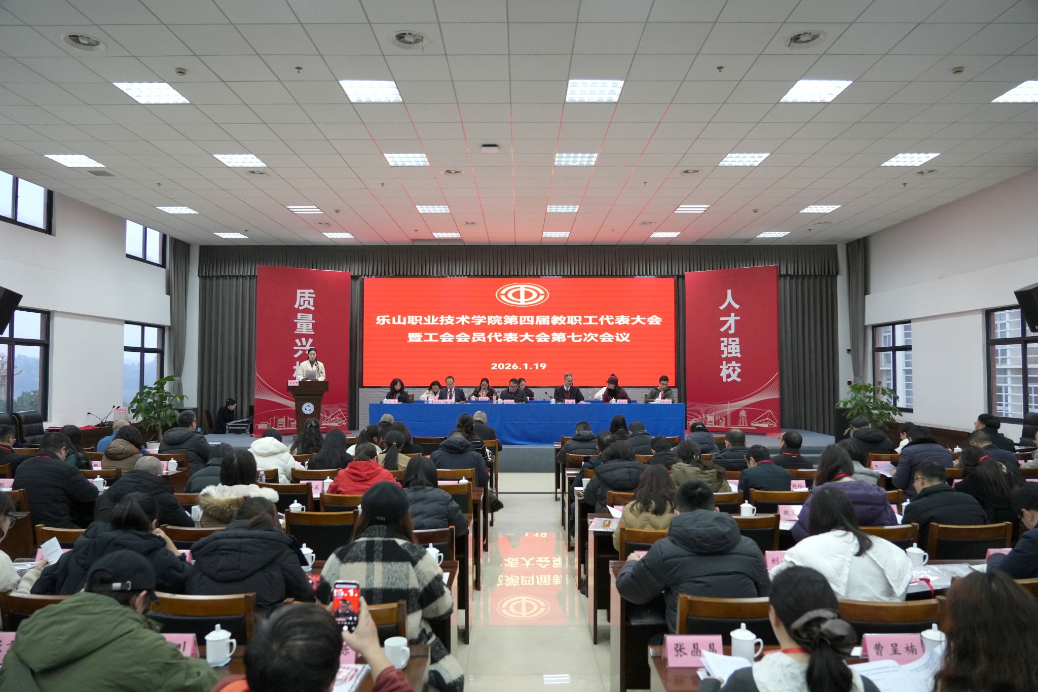 1月19日,8797威尼斯老品牌第四届教职工代表大会暨工会会员代表大会第七次会议在学术交流中心3004会议室召开。学校党委书记成定彬,校长刘忠,党委副书记、工会主席张佳,纪委书记李昌贵,党委委员、副校长张学河、周芹,以及教代会代表共计78人参加会议。部分中层干部列席会议。