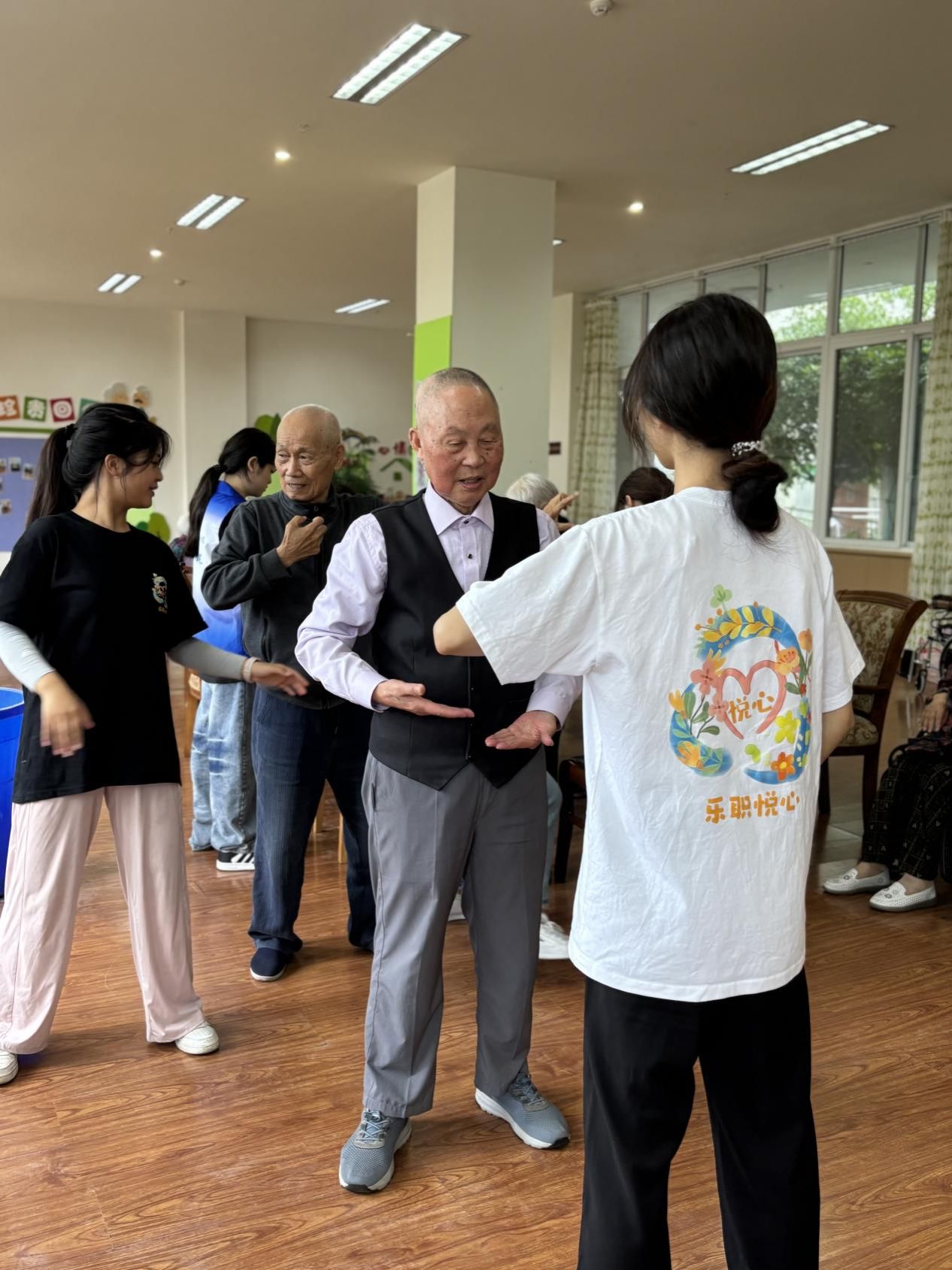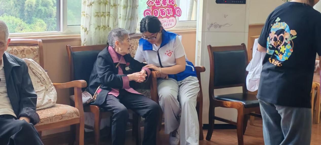 志愿者们为老人们捶背揉肩,倾听他们讲述人生往事。陪伴是最长情的告白,看到老人们眼里的光,同学们也更深刻理解了“老吾老”的意义。