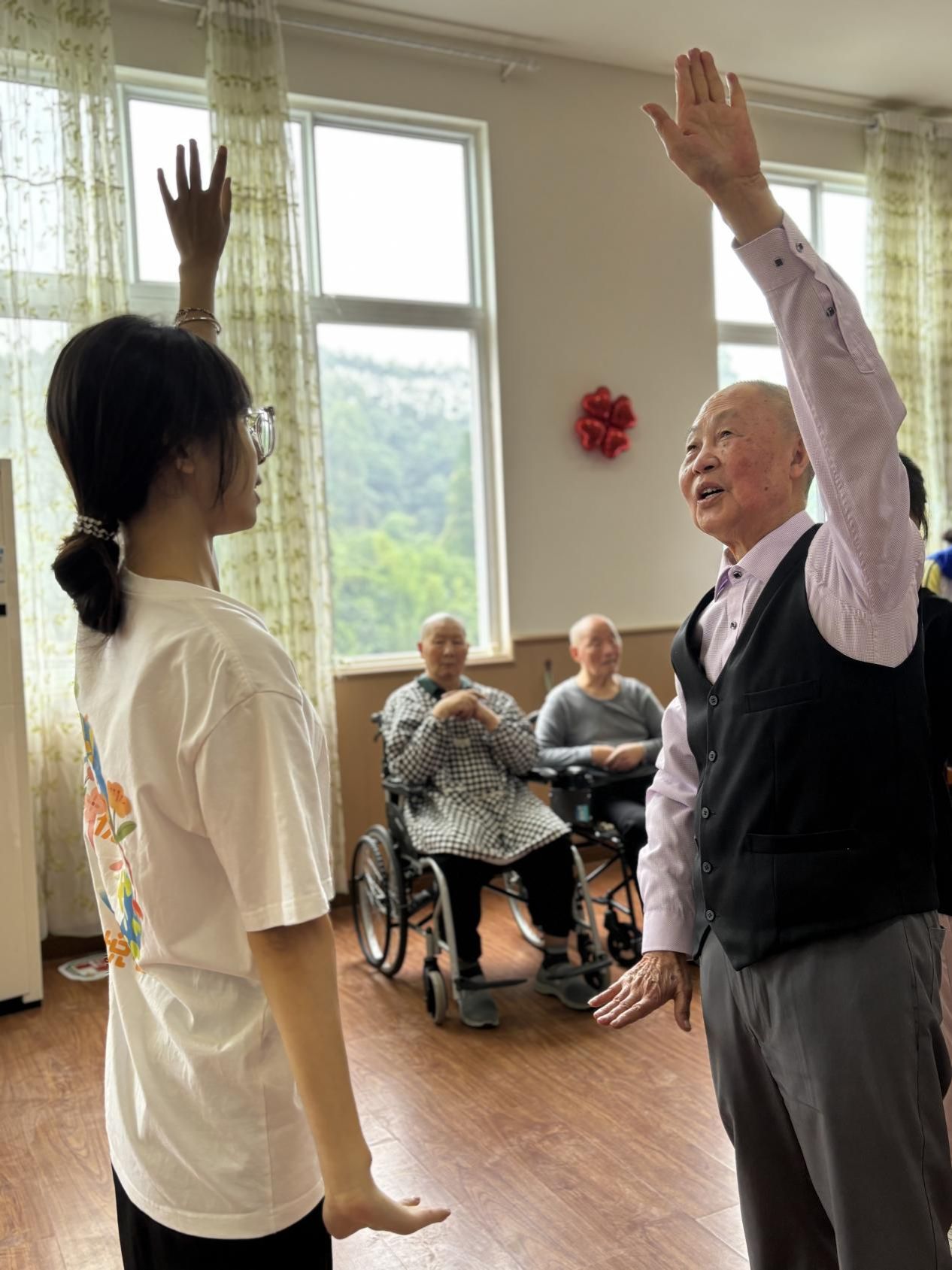 在“教学互动”环节中,志愿者们分组带领老人们学习八段锦基础动作。“双手托天理三焦,左右开弓似射雕……”同学们用通俗易懂的口令分解招式,并一对一纠正姿势。