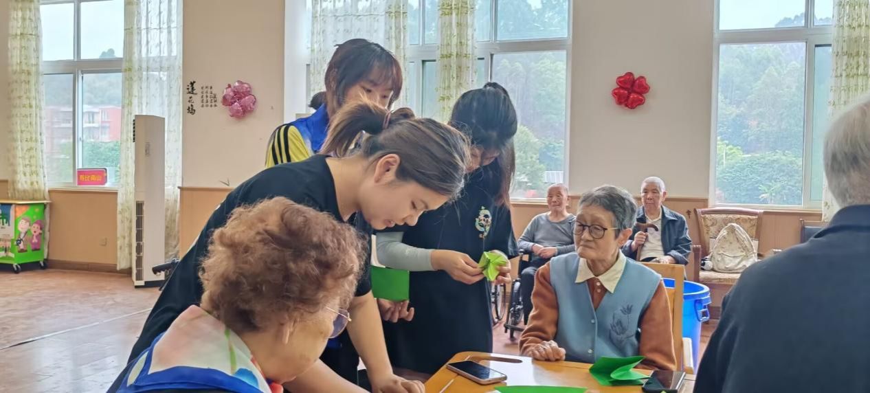 志愿者们与老人们围坐一堂,共同折叠象征健康长寿的千纸鹤。同学们耐心讲解步骤,手把手协助老人完成作品。彩纸在指尖翻飞,一只只栩栩如生的纸鹤逐渐成形,承载着对美好生活的祝福。现场欢声笑语不断,温馨氛围悄然流淌。