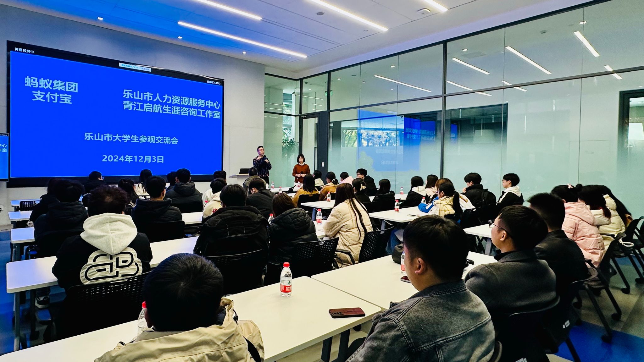 支付宝数字就业川藏业务总监刘济铭、蚂蚁集团战略发展总监汪莉向同学们详细介绍了企业发展历程、业务范围和企业文化,分享职场经验与职业发展心得,解答学生疑问。乐山市人力资源服务中心市场部杨跃超分享了自己的职场成长经历,杨鸿就同学们的疑惑进行了现场指导。