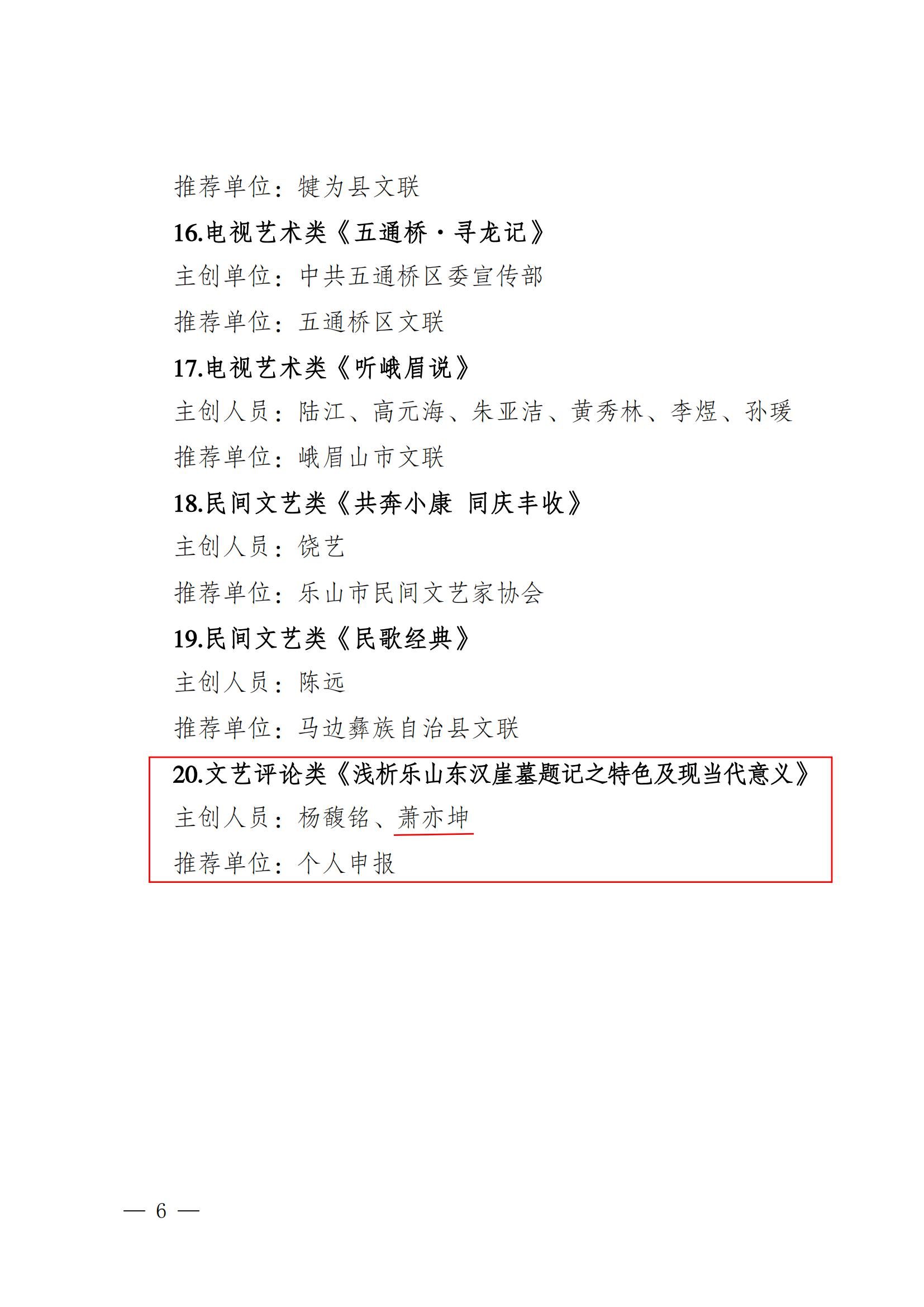 今年 2 月,乐山市文联启动了 2024 年度“20 佳推优”工程申报评选工作,经初审、终审,并结合公示收集到的意见建议,市文联主席团研究决定,评选出“特别项”作品 7 件、“入选项”作品 20 件,组织工作突出单位 10 个。8797威尼斯老品牌素质教育学院美育教研室教师萧亦坤的文艺评论《浅析乐山东汉崖墓题记之特色及现当代意义》入选2024 年度“20 佳推优”工程“入选项”。