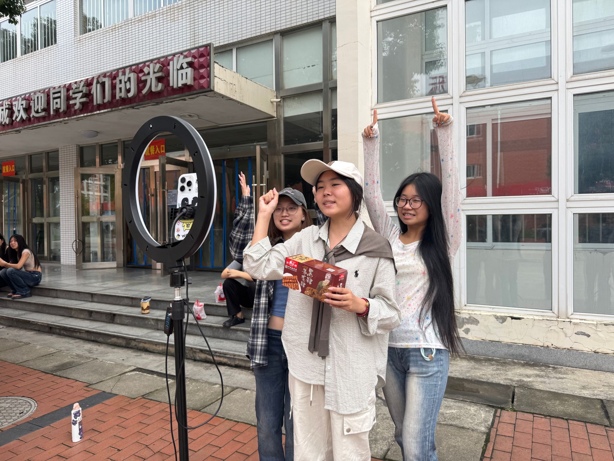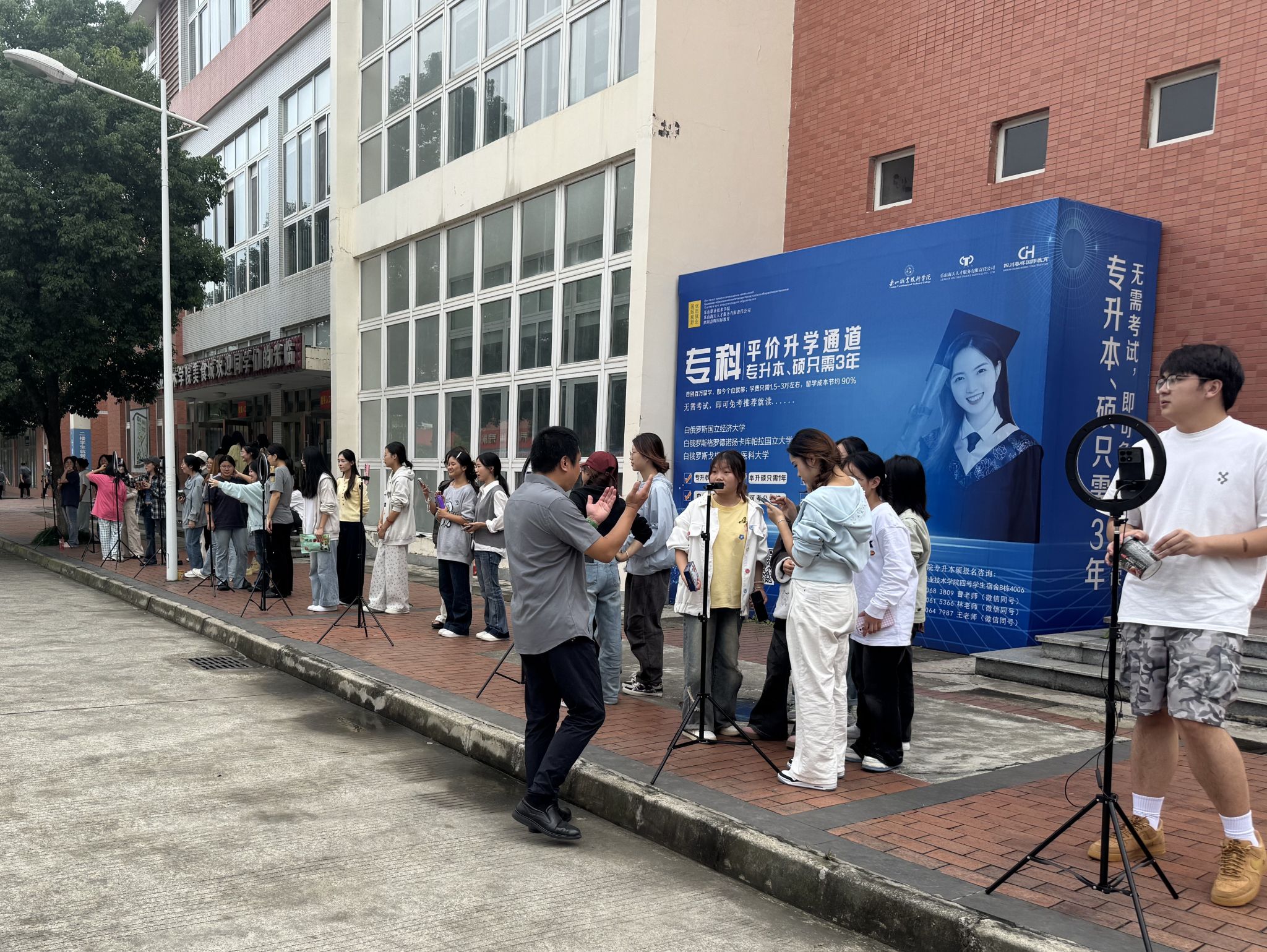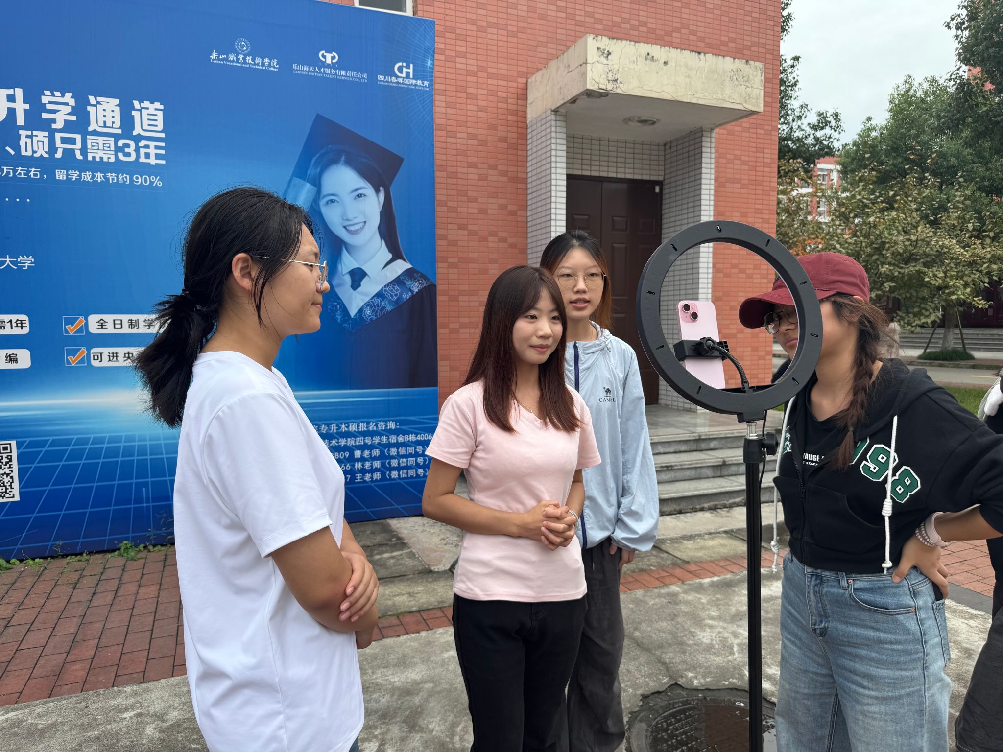 将直播间搬至户外广场,让课堂对接产业需求。9 月 29 日下午,数字经济与管理学院创新教学场景,在校园户外广场开展“主播表现力专项实训”,通过沉浸式、场景化训练破解电商专业学生“镜头恐惧”痛点,为乐山打造 “美食之都”培养实用型直播人才,助力本地美食及农特产品走向更广阔市场。