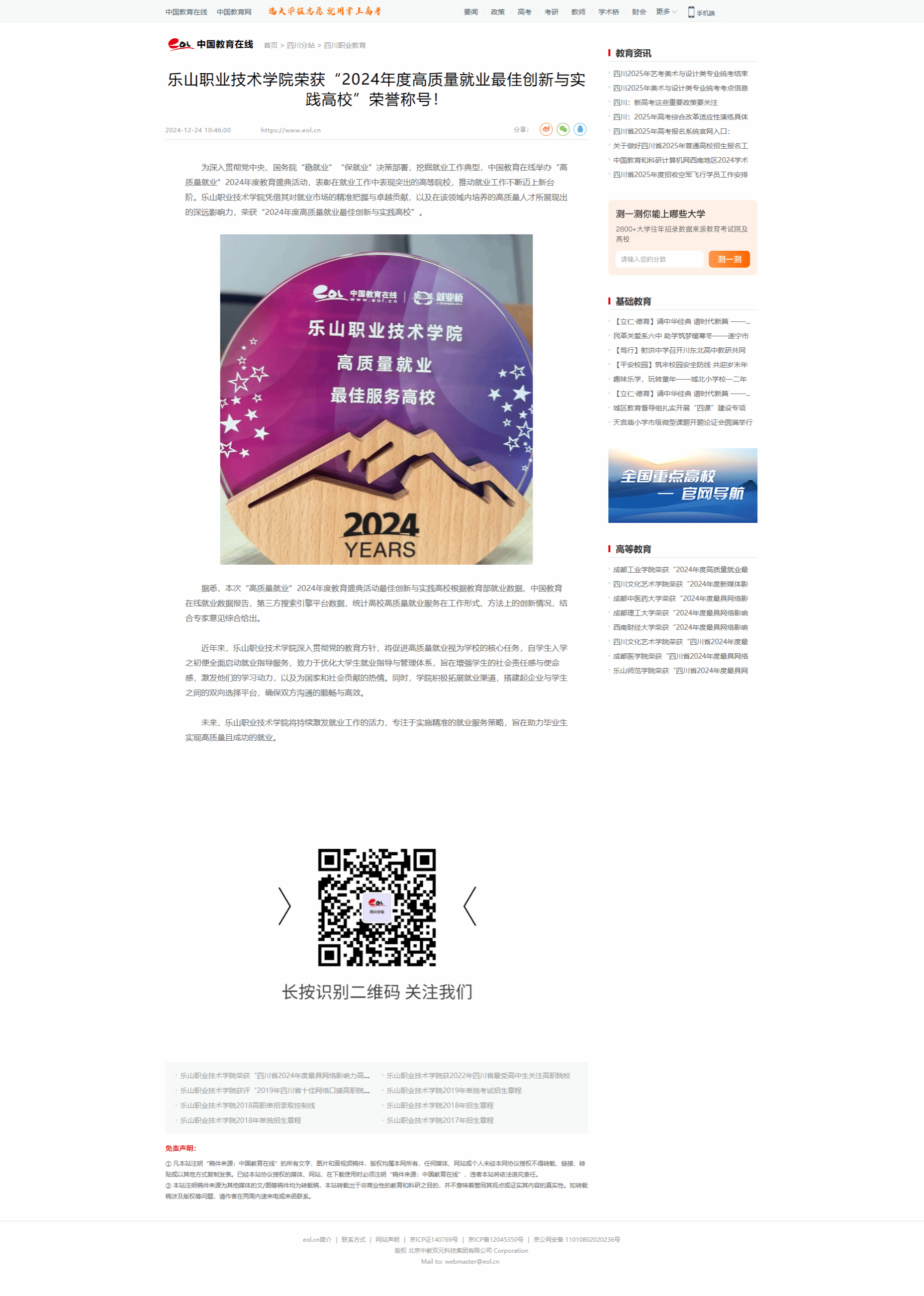 中国教育战线:8797威尼斯老品牌荣获“2024年度高质量就业最佳创新与实践高校”荣誉称号!