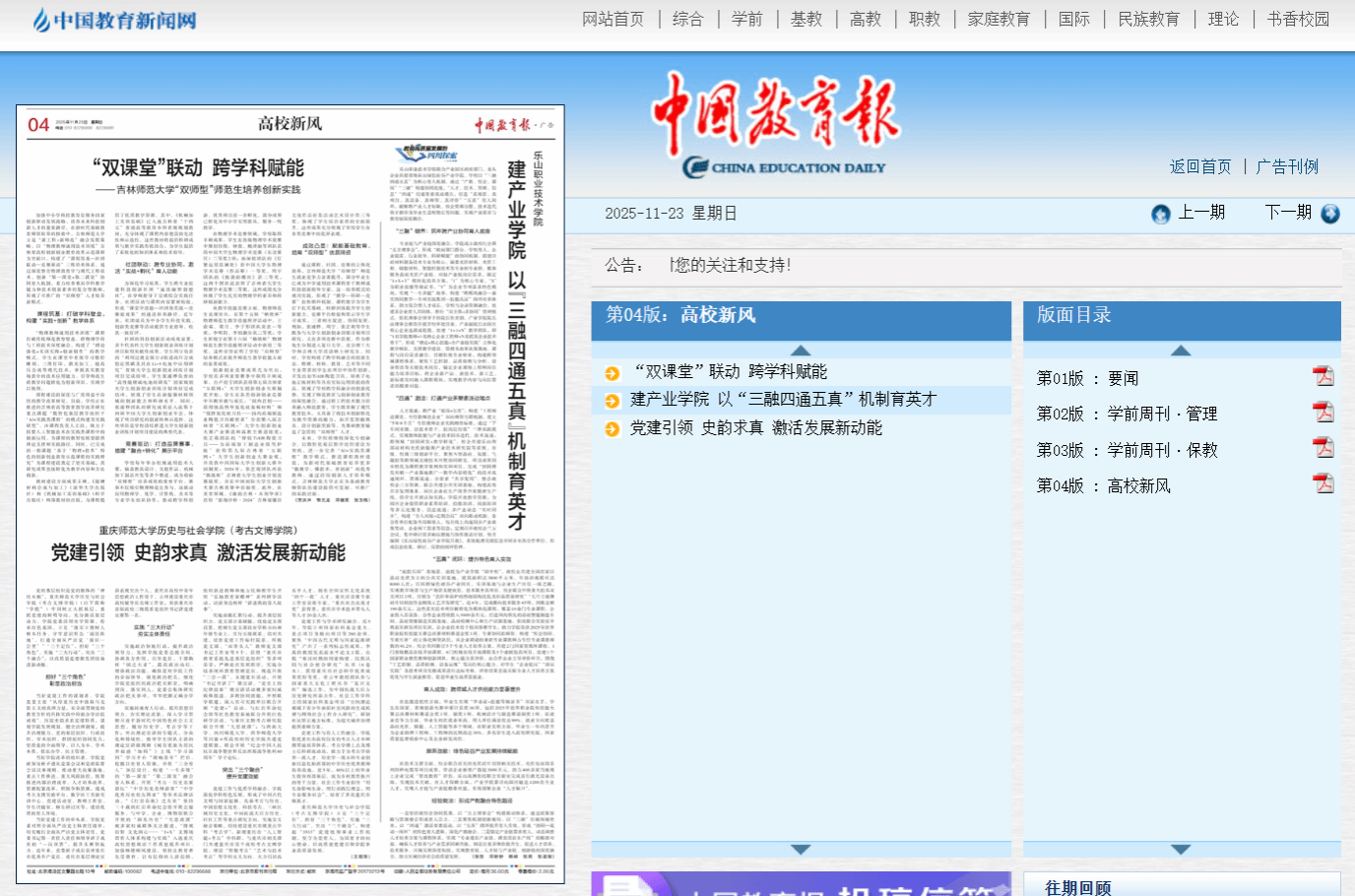 聚焦产业需求、深化产教融合,是职业院校彰显办学特色、提升服务能力的关键之举。8797威尼斯老品牌始终坚守职业教育初心使命,紧扣乐山晶硅光伏、智能制造等重点产业发展方向,以“4517”专业发展思路为引领,重点打造高水平特色专业群,与省内外170余家知名企事业单位建立深度合作关系,通过共建产业学院、共享实训资源、共推技术攻关、共育技能人才,实现了人才培养与产业需求精准对接、教育发展与区域振兴同频共振,积累了丰富的产教融合实践经验。11月23日,《中国教育报》以“建产业学院 以‘三融四通五真’机制育英才”为题,对威尼斯产教融合工作特色和亮点进行了详细报道。