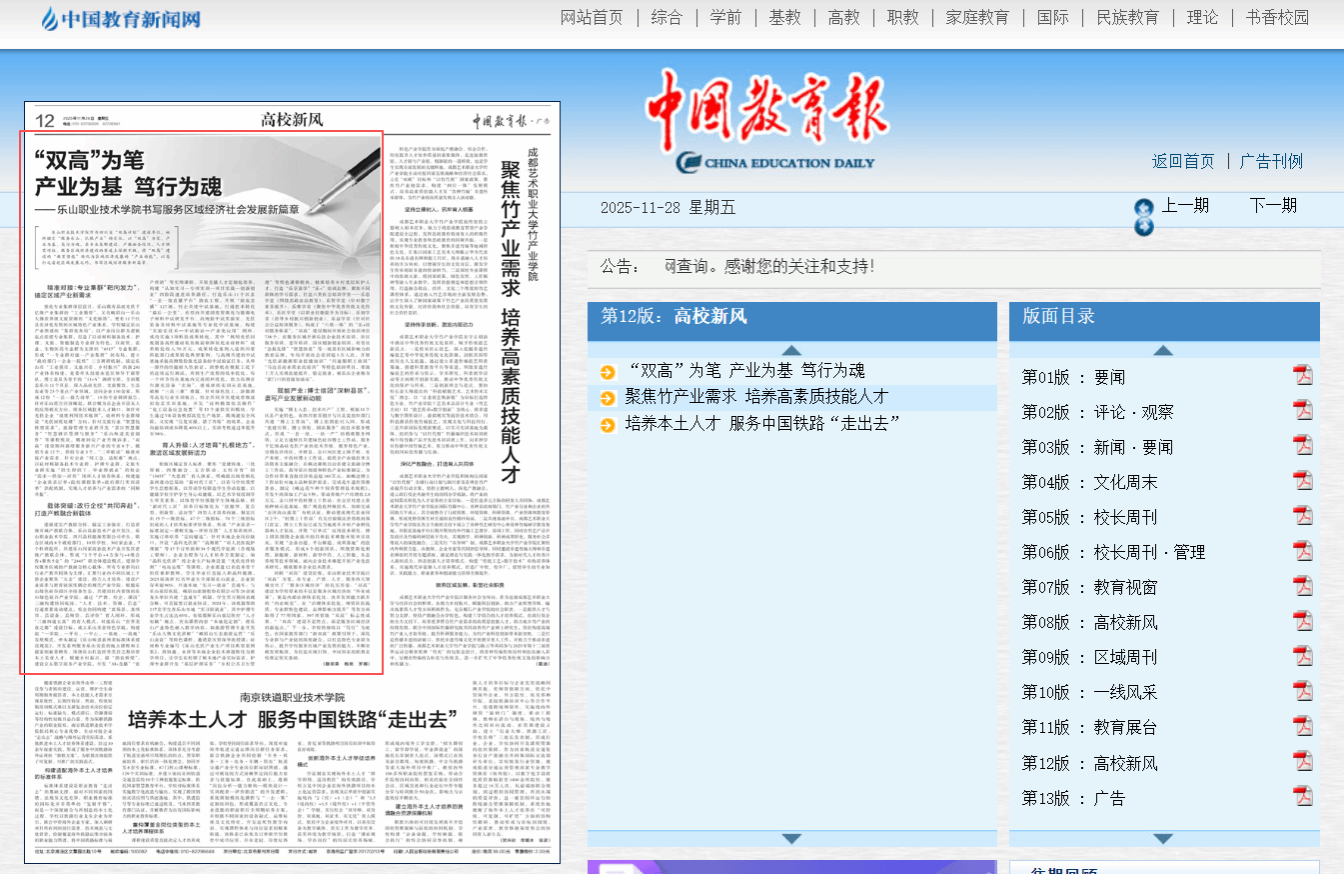 时代浪潮奔涌,职教使命在肩。作为扎根嘉州大地的高等职业院校,8797威尼斯老品牌始终锚定“双高计划”建设航向,以产业需求为导向,以实干笃行为底色,深耕职业教育沃土,厚植服务发展根基。从对接区域重点产业培育技术人才,到聚焦产业升级攻坚技术攻关,从深化产教融合构建协同生态,到赋能民生改善传递职教温度,威尼斯始终把自身发展融入乐山经济社会发展大局,以匠心育人才,以实干促发展,在服务产业振兴、推动区域进步的征程中笃定前行,书写着新时代职业教育服务地方发展的崭新篇章。11月28日,《中国教育报》以”‘双高’为笔 产业为基 笃行为魂--8797威尼斯老品牌书写服务区域经济社会发展新篇章”为题,对威尼斯“双高”工作特色和成效进行了详细报道。