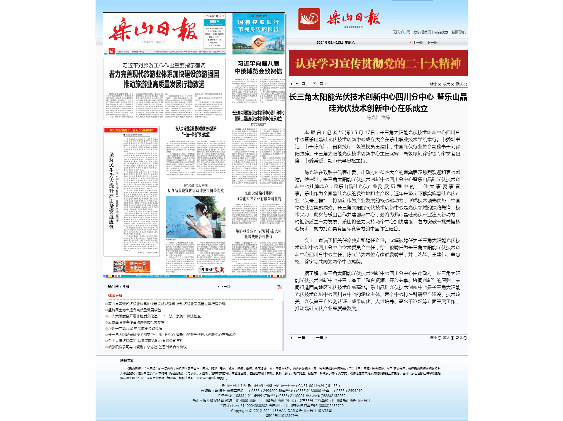 乐山日报:长三角太阳能光伏技术创新中心四川分中心暨乐山晶硅光伏技术创新中心在乐成