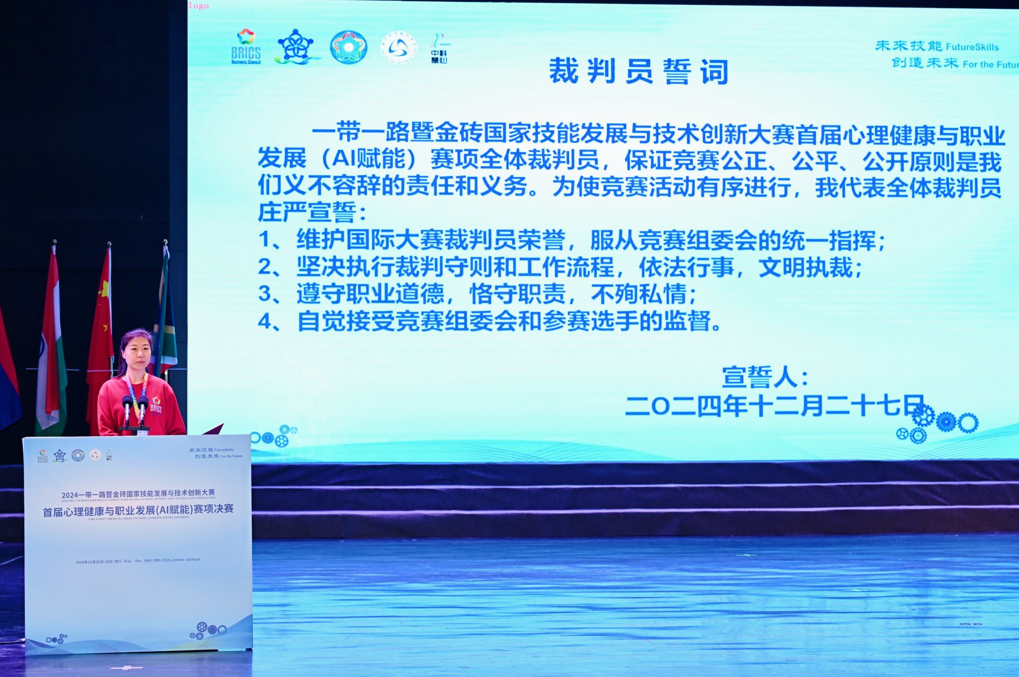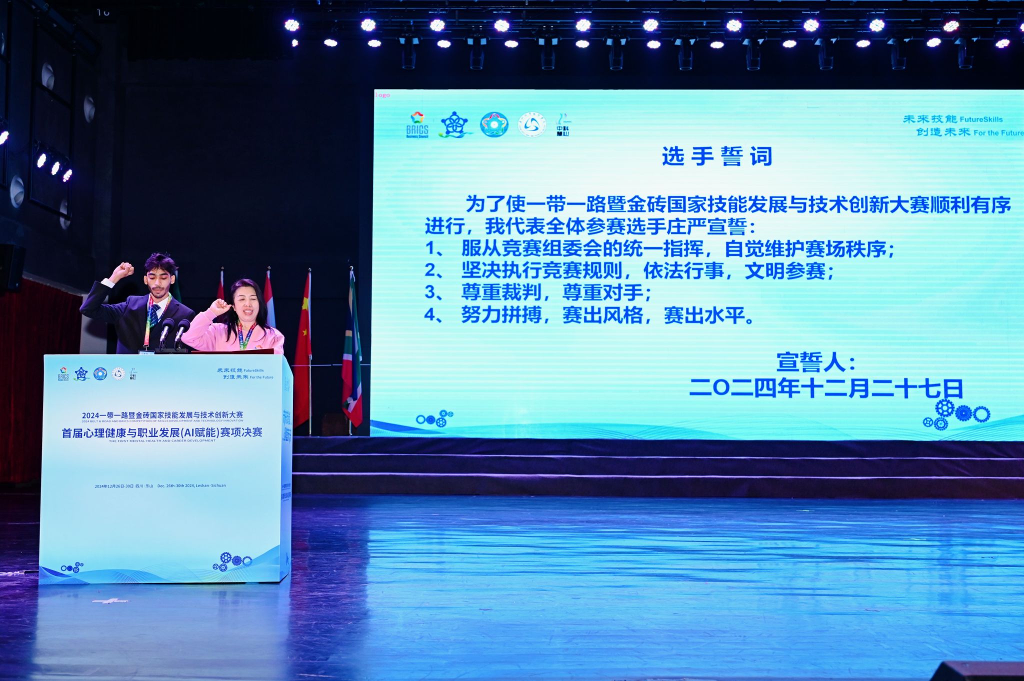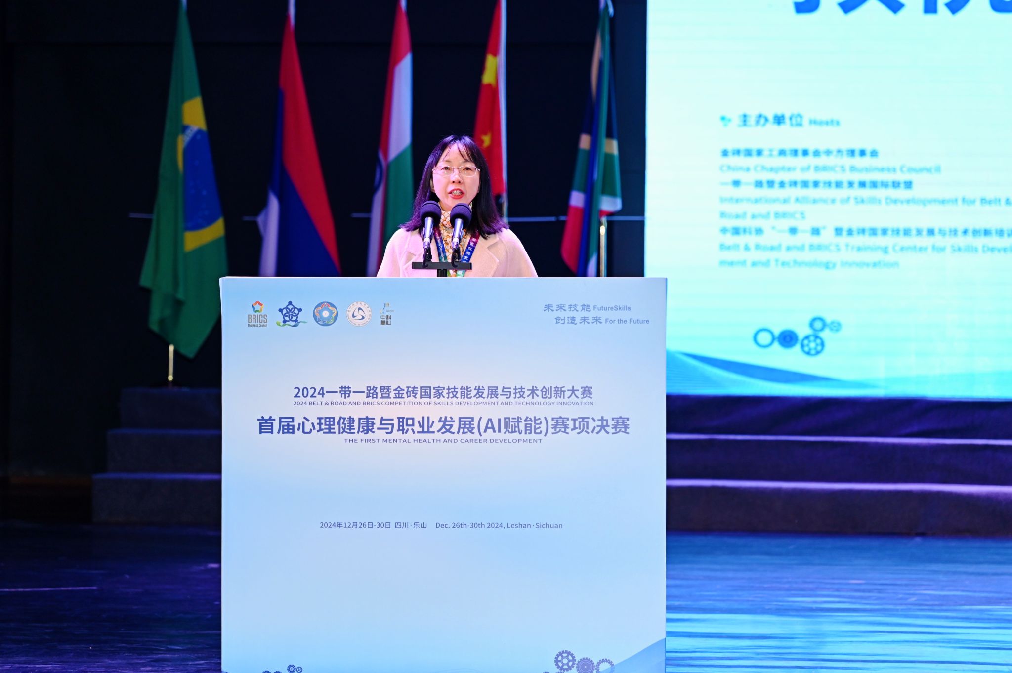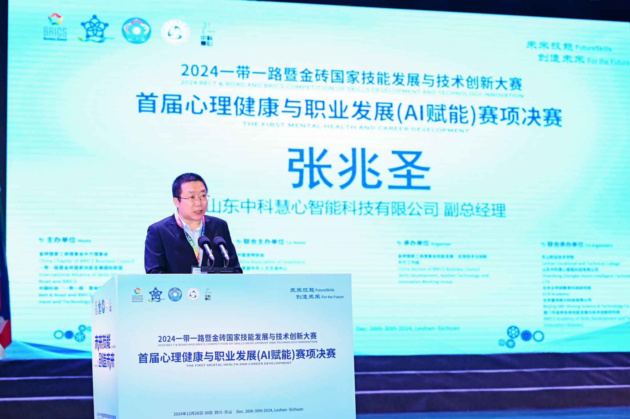 12月27日,“2024‘一带一路’暨金砖国家技能发展与技术创新大赛首届心理健康与职业发展(AI赋能)赛项”决赛在学校开赛。金砖国家技能发展与技术创新大赛组委会执委会国内竞赛办公室主任宋小琴,原国家卫生健康委能力建设与继教中心学术部主任刘晨,北京大学心理学系培训部主任李同归,北京企学研教育科技研究院竞赛合作处主任周海燕,山东中科慧心智能科技有限公司副总经理张兆圣,8797威尼斯老品牌校长刘忠,党委副书记张佳,党委委员、副校长陈元进、封家福、周芹等校内外领导和嘉宾出席开幕式。学校各职能部门(处室)和二级学院负责人、全体专职辅导员老师以及各院校参赛师生现场参加了开赛式。张佳主持开赛式。