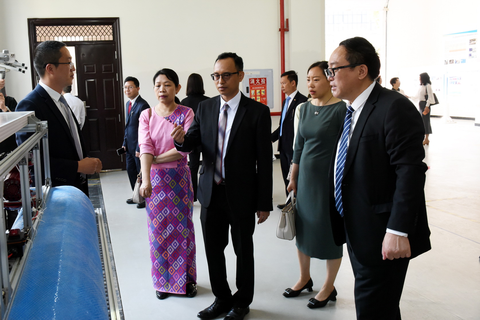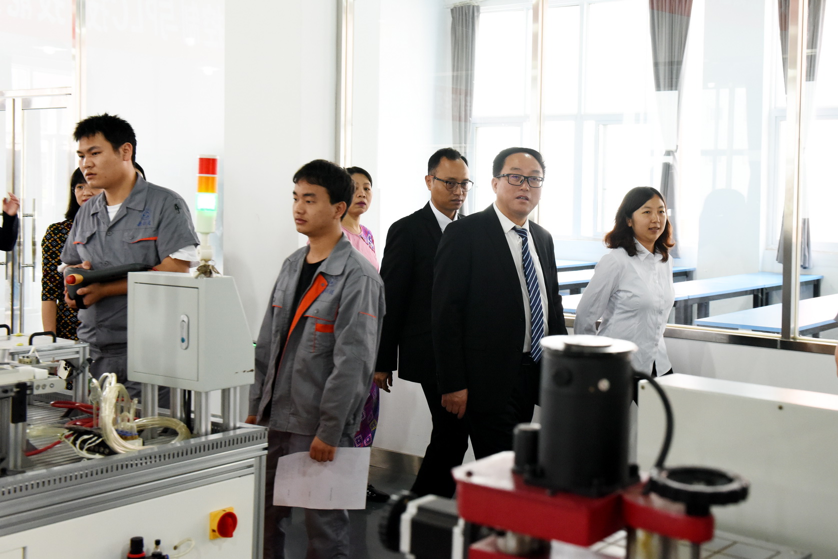 吕真才一行首先来到留学生教室观看留学生中国文化课展示,随后在学院礼堂观看了学院宣传片,在青江武术基地观看学生武术训练,在汽车检测与维修实训基地、工业机器人技术实训基地、多晶硅实训基地观看学生实训情况。