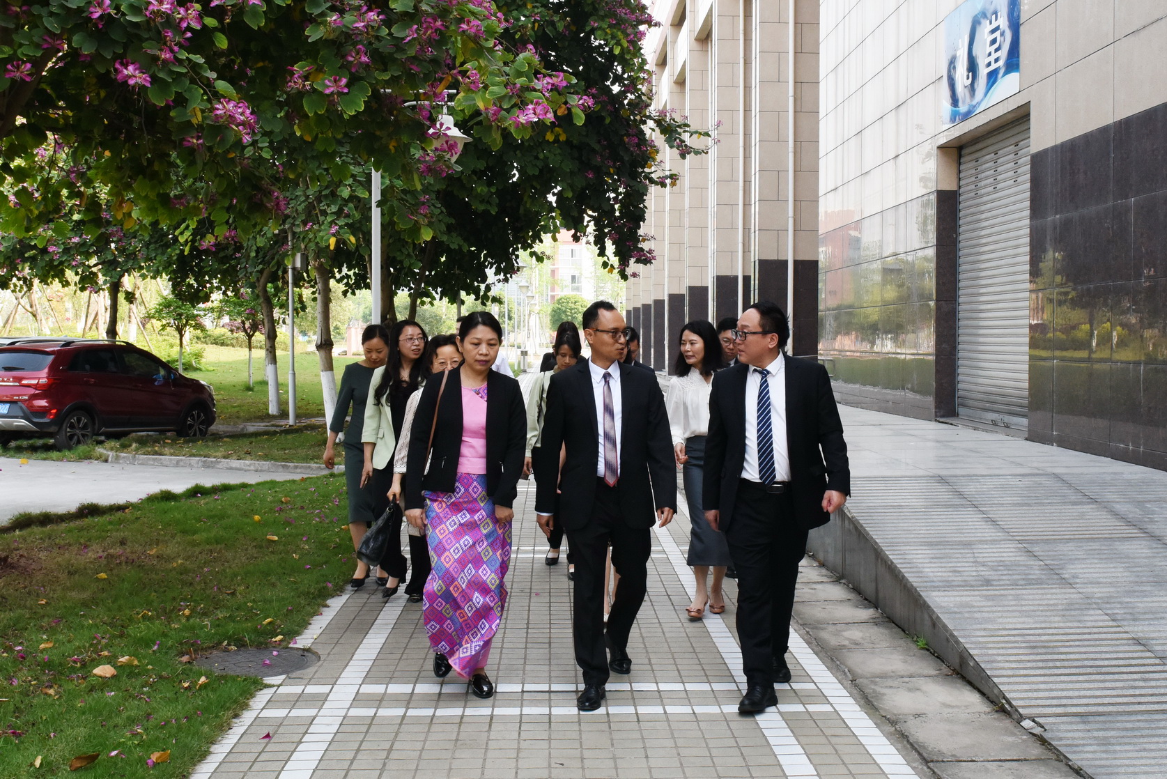 参观结束后,成定彬向总领事赠送了学院办学70周年纪念画册,宾主双方在图书馆前合影留念。