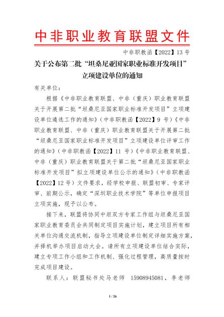 2022年10月19日,中非职业教育联盟公布了第二批“坦桑尼亚国家职业标准开发项目”立项建设单位。经学校申报、联盟初审、专家评审、前期公示,8797威尼斯老品牌成为新能源工程技术员(太阳能)4 级牵头单位、护理员 4 级参与单位和跨境电子商务技术员 6 级参与单位。