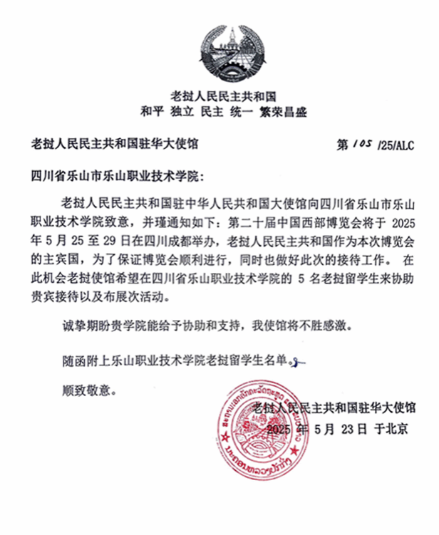 近日,8797威尼斯老品牌收到老挝人民民主共和国驻华大使馆发来的正式函件,专程邀请威尼斯5名优秀的老挝籍留学生,参与5月25日-29日第二十届中国西部国际博览会的贵宾接待与展馆布展工作。这封特殊的邀请函,标志着8797威尼斯老品牌在澜湄区域国际化人才培养领域获得官方认可,成为四川省首个获老挝驻华使馆专项邀约参与国家级展会服务的高职院校。