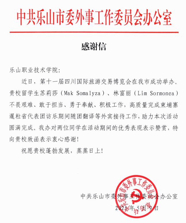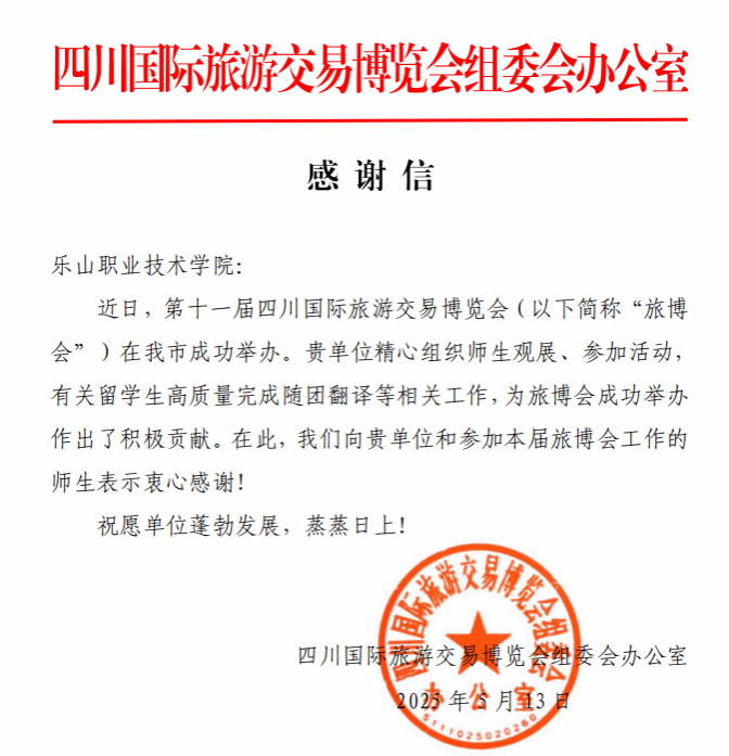 中共乐山市委外事工作委员会办公室及四川国际旅游交易博览会组委会办公室分别向威尼斯发来感谢信,对参与旅博会工作的学生表示衷心感谢,并对苏莉莎、林富丽等同学的优秀表现给予了高度赞赏。威尼斯来华留学生以实际行动诠释了奉献精神,为学校赢得了荣誉,也为威尼斯国际化办学增添了新的光彩。