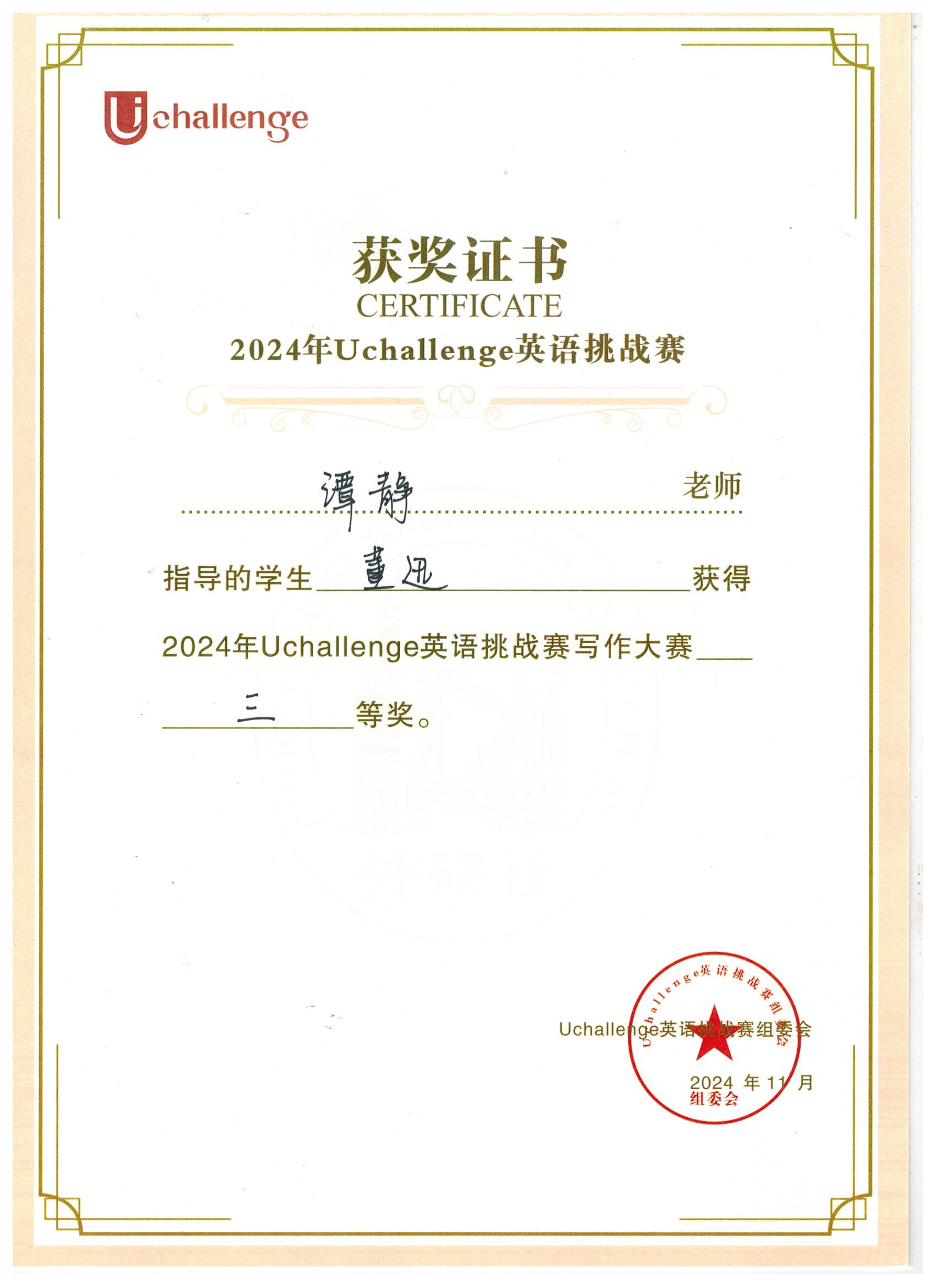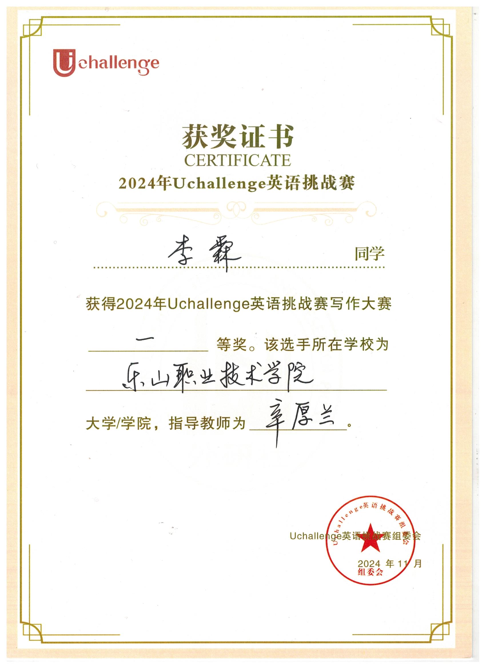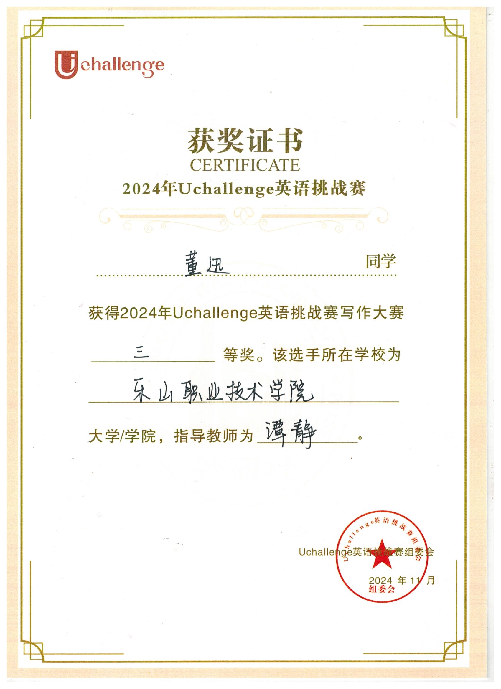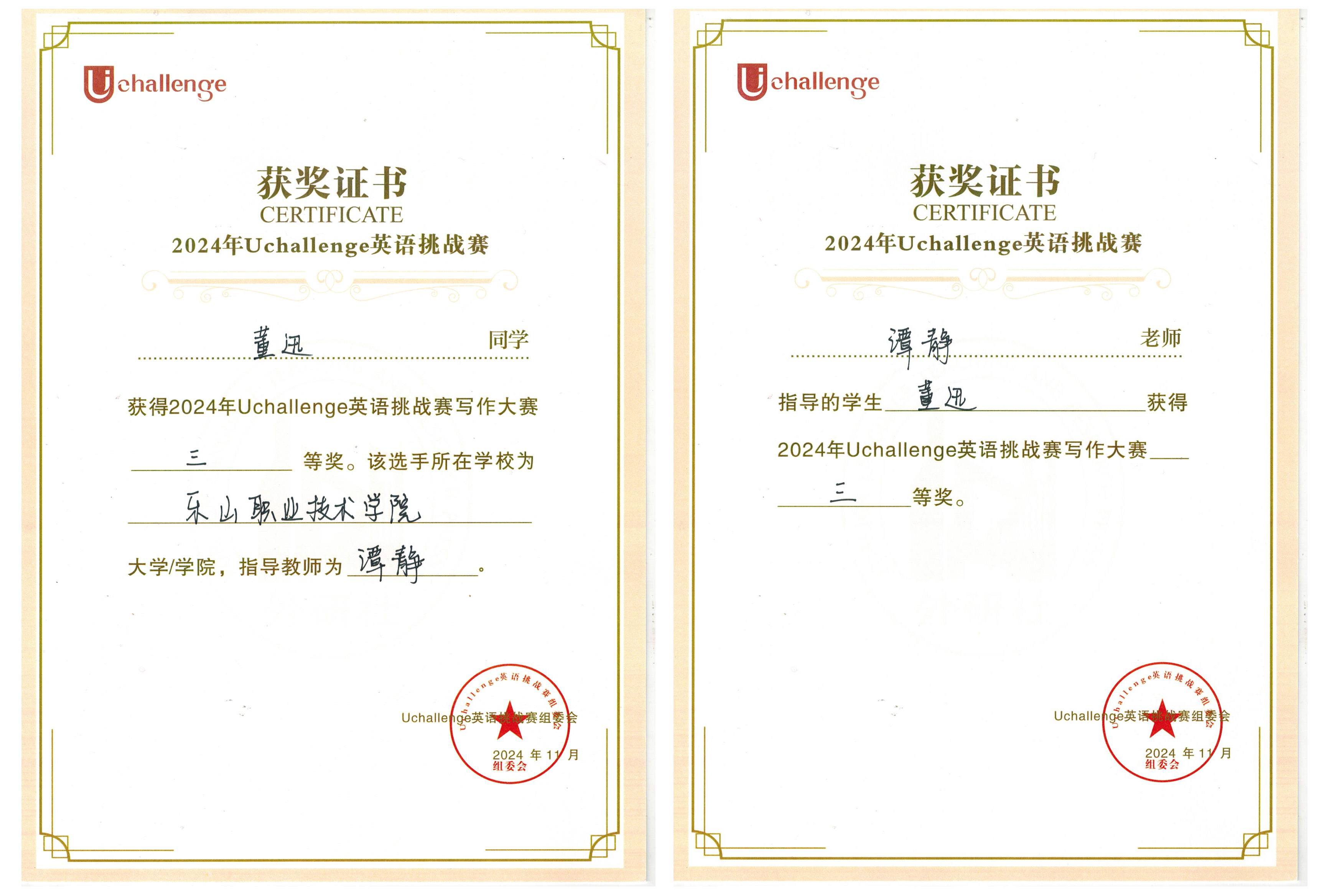 11月30日,2024年四川省高等职业院校Uchallenge英语挑战赛决赛在四川工程职业技术大学落幕。8797威尼斯老品牌临床医学学院口腔专业2024级1班学生王彩林在英语挑战赛(英语演讲比赛)中,获得一等奖并晋级国赛。在英语挑战赛(英语写作比赛)中,中医康养学院中医专业2023级1班学生李霖获得一等奖、数字经济与管理学院会计专业2023级3班学生董迅获得三等奖。