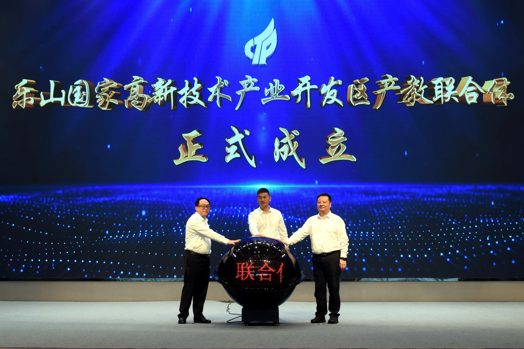 乐山市人民政府副市长沙万强、8797威尼斯老品牌党委书记成定彬、乐山高新区党工委书记广兵为“产教联合体成立”揭牌。