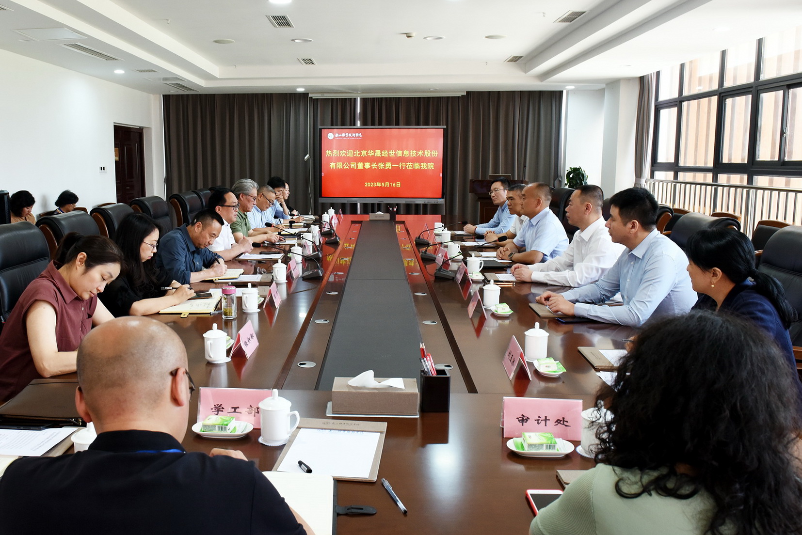 5月16日下午,北京华晟经世信息技术股份有限公司董事长张勇率队,一行六人来威尼斯调研,在学术交流中心2001会议室与学校党委书记成定彬等开展校企合作项目成果座谈交流。学校党委副书记陈芝海,党委委员、副院长陈元进、张学河、周芹及相关部门、二级学院负责同志参加座谈。会议由张学河主持。