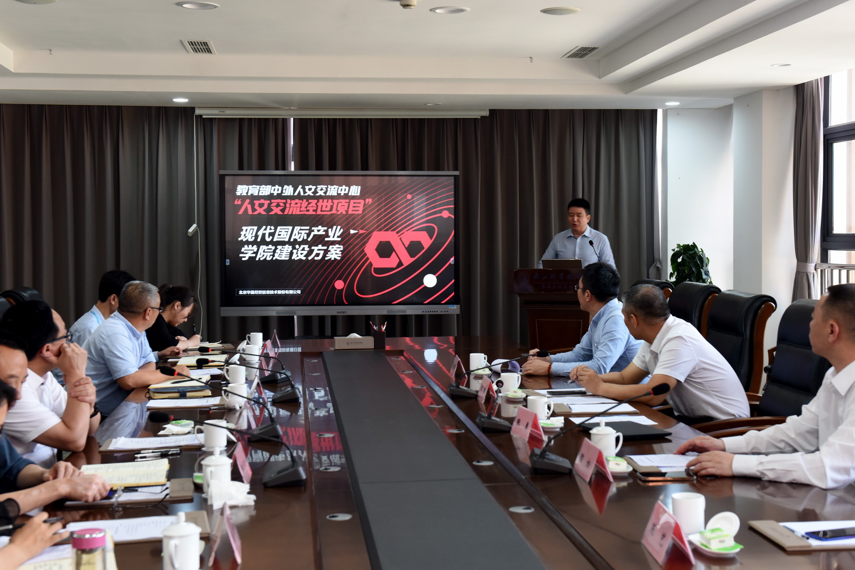 北京华晟经世信息技术股份有限公司事业部总经理王辉、教育技术总监王振宇、解决方案总监苑艺分别作了题为《校企合作项目成果汇报》《现场工程师项目申报工作进展》《国际现代产业学院建设方案》的报告。