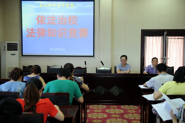 这次竞赛活动由学院工会组织安排;一是由学院思想政治理论课教学部负责编写了《依法治校知识竞赛资料汇编》手册并印发给全院教职工,二是以《依法治校知识竞赛资料汇编》为主要内容依据统一命题;三是学院工会主席陈国银、副主席罗宣祝监考;四是由学院思想政治理论课教学部负责确定评分标准,组织统一评卷。