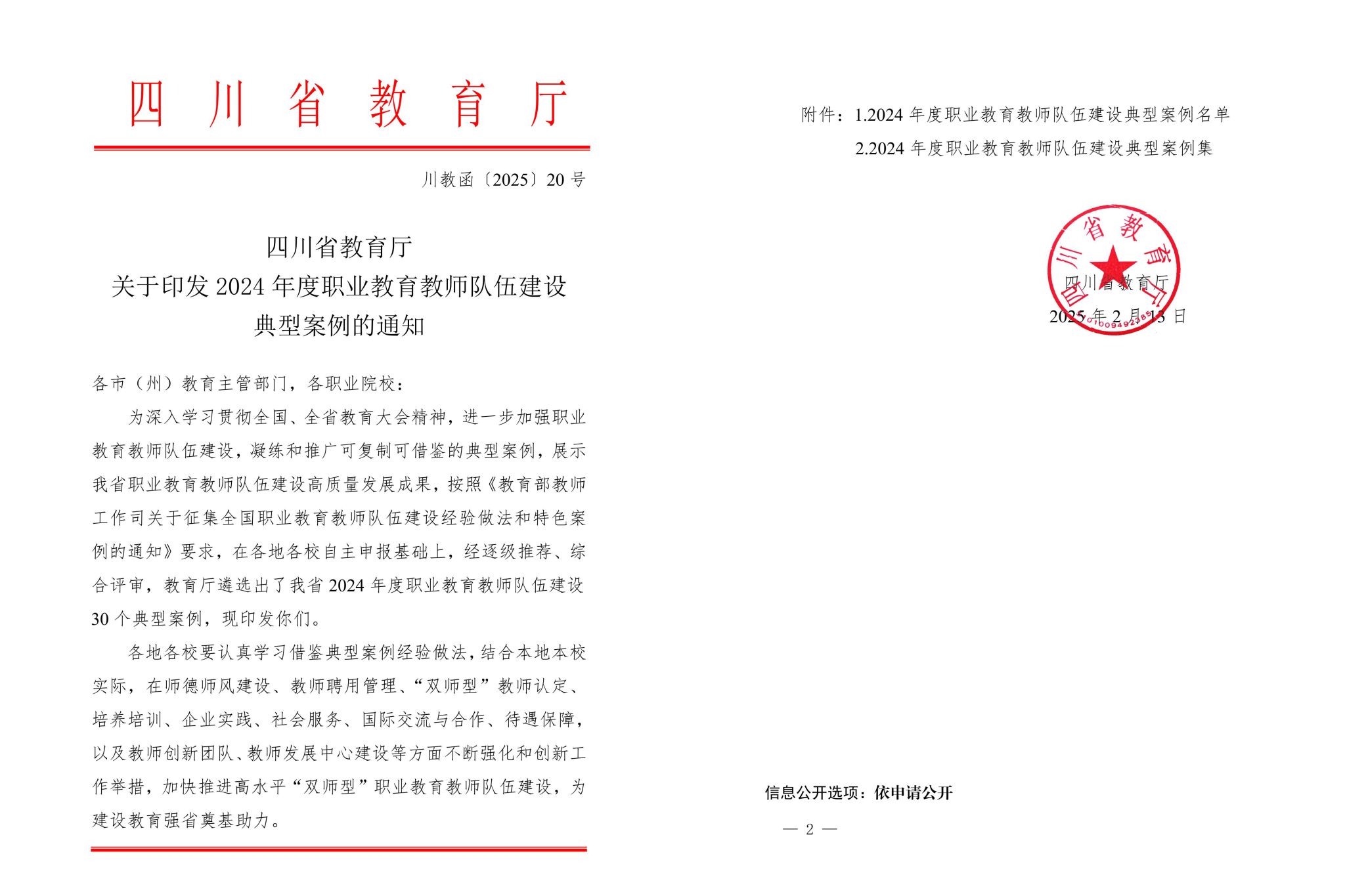 为进一步加强四川省职业教育教师队伍建设,凝练和推广可复制、可借鉴的典型案例,展示我省职业教育教师队伍建设的高质量发展成果,2月13日,四川省教育厅发布了《2024年度职业教育教师队伍建设典型案例集》,共评选出30个典型案例。8797威尼斯老品牌《文化引领 平台支撑 项目驱动,打造“阳光之师”职业教育教师创新团队》成功入选。
