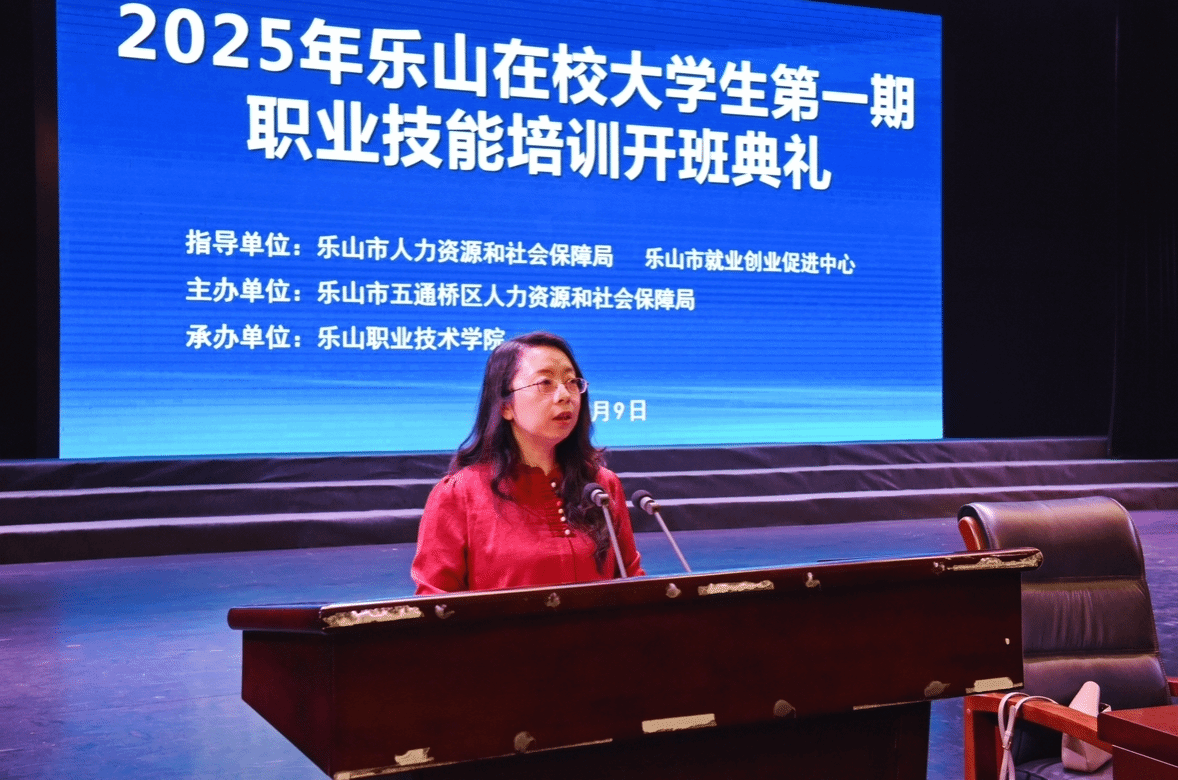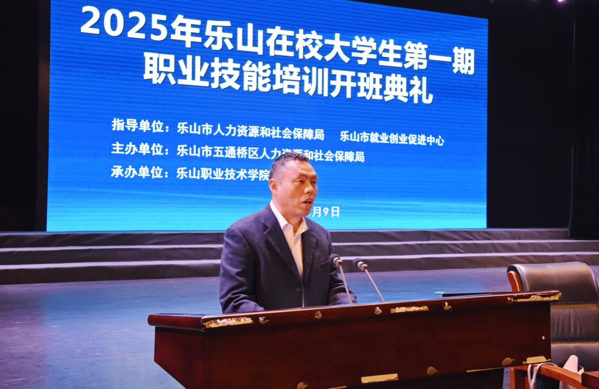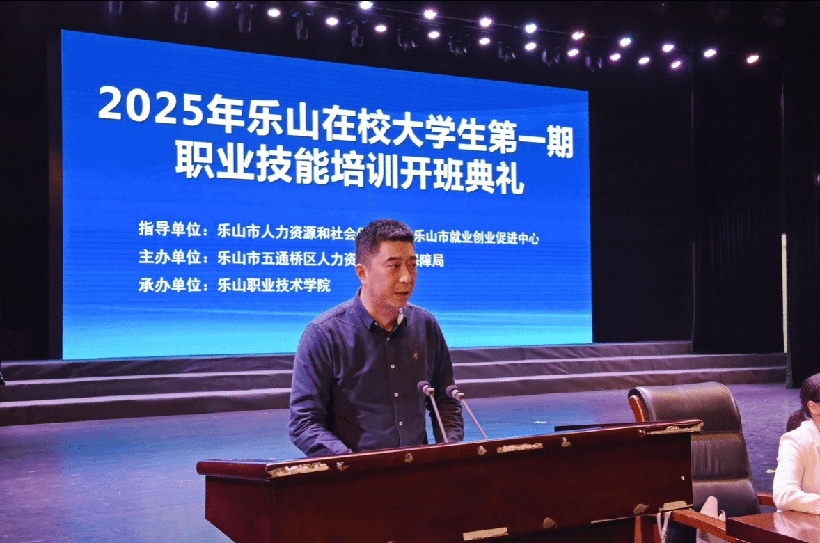 为深入贯彻落实国务院、省政府、市政府决策部署,扎实推进乐山市职业技能提升行动,4月9日下午,2025年乐山在校大学生第一期职业技能培训班开班典礼在8797威尼斯老品牌礼堂隆重举行。此次培训班由五通桥区人力资源和社会保障局与8797威尼斯老品牌共同举办,旨在提升乐山在校大学生的职业技能,促进大学生就业。