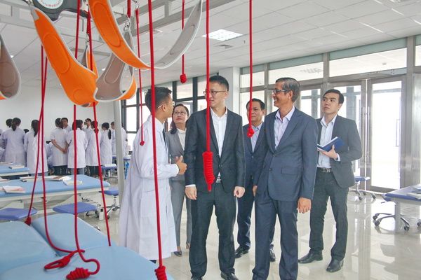 萨达罗一行先后参观了学院多功能训练馆、多晶硅生产仿真工厂、护理实训室,了解了学院的办学规模、发展概况、专业实训和人才培养等情况,观摩了急救课堂、康复理疗课堂教学,并就专业实训设备与任课教师进行了交流。