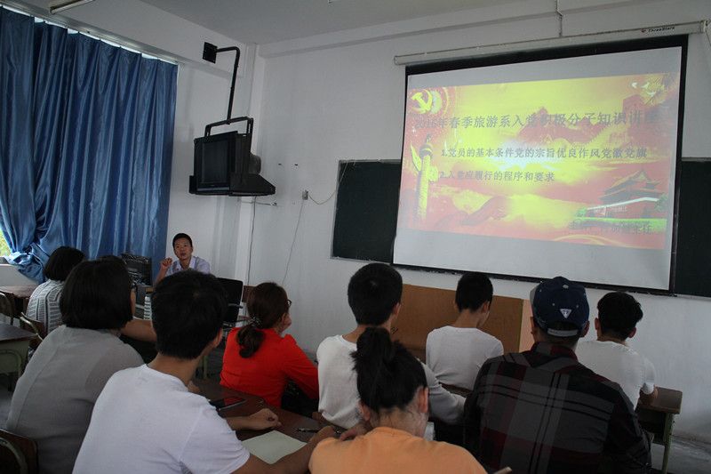 为了提高同学们党的基本知识,更加深入的了解中国共产党。旅游系于5月6日十二点四十在综合楼二楼多媒体教室开展入党积极分子知识讲座,由系副主任何加健主讲,新一批的入党积极分子接受培训。