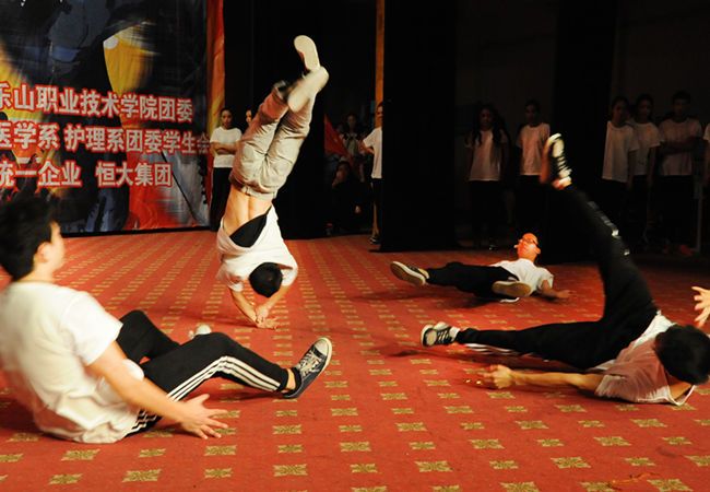 大礼堂灯光璀璨,座无虚席,比赛现场气氛空前热烈。来自全校10个系部同学同台竞技。率先登场的是护理系的串烧《shots》,以其动感的旋律、轻快的节奏,迅速引爆全场。财经系的《律动》奔放洒脱,以其强大的阵容、专业的表演,震撼全场,营造出热烈的气氛。紧接着其他系的节目也轮番上场《青春起跑线》、《NO NO NO》,带给大家视觉享受。旅游系学生表演的《hiphop中国风》21名学生身着“中国”“青春”字样的运动装,伴着节奏尽情舞蹈,诠释出最富活力的青春姿态,同学们展示出高难度的技巧动作瞬间吸引观众的眼球。整个舞蹈编排创新、内容丰富、设计精巧,表演到位,将现代舞与传统武术太极拳相结合,有快有慢、有静有动,节奏感强烈 层次分明。同学们精彩的表演使得现场掌声、尖叫声不断,将整个比赛推向高潮,并得到评委们的一致好评,获得一等奖。整场比赛在护理系学生动感的舞蹈《火力全开》中完美落幕。